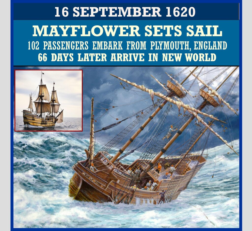 16 SEPTEMBER 1620 â The Mayflower sails from Plymouth, England, bound for the New World with 102 passengers. The ship