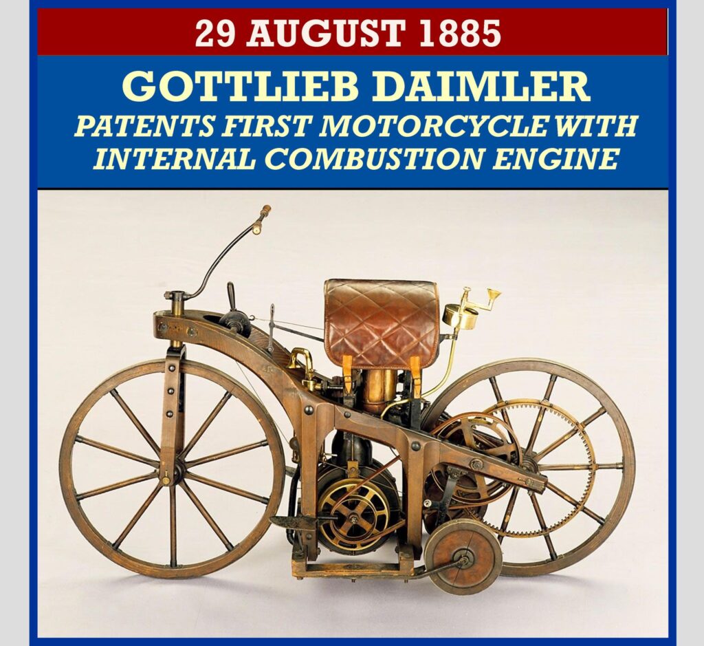 1885: Gottlieb Daimler patents what is generally considered to be the first true motorcycle. Daimler, the automotive pioneer usually associated