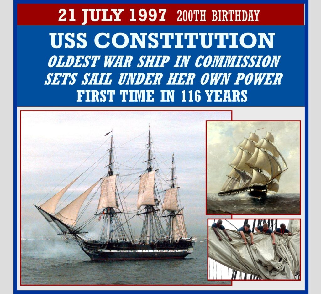 USS Constitution sailed under her own power, downwind for one hour, for the first time in 116 years, in commemoration