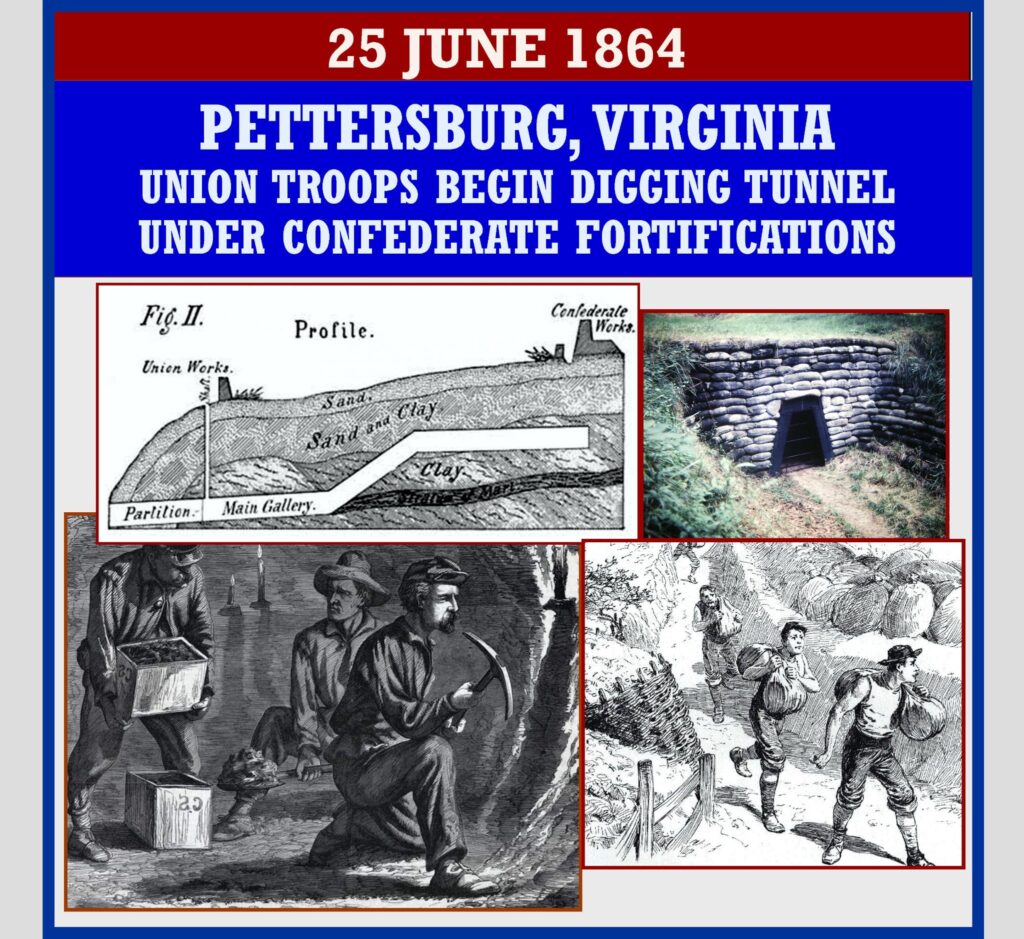 Pennsylvania troops begin digging a tunnel toward the Rebels at Petersburg, Virginia, in order to blow a hole in the