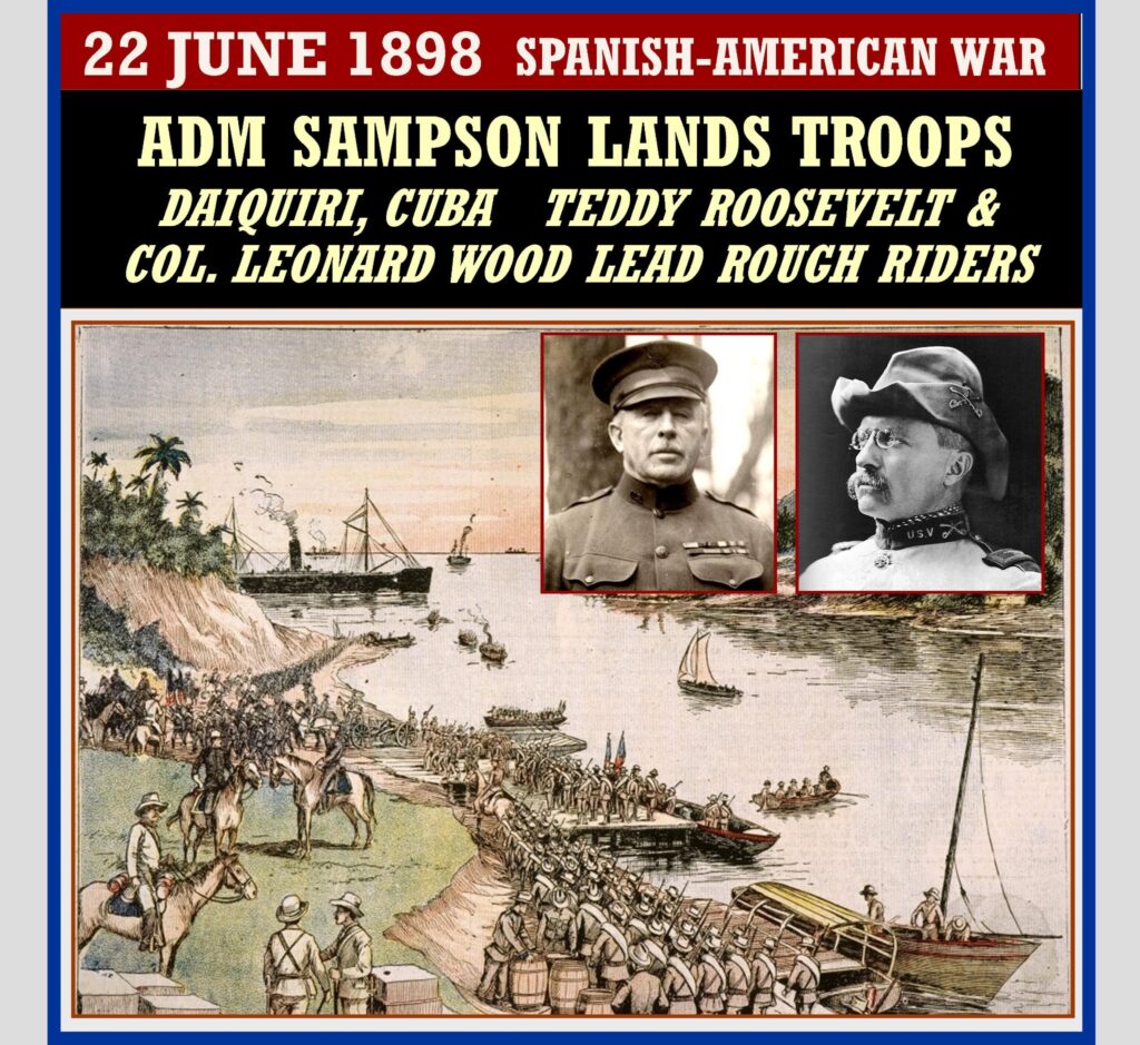 22 JUNE 1898 Admiral Sampson orders troops to be landed at Daiquiari, Cuba. Landing was a complicated process that began