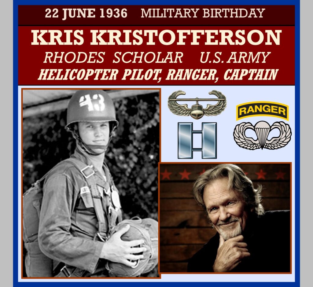 Kristoffer Kristofferson (born June 22, 1936) is a retired American singer, songwriter and actor. Among his songwriting credits are the