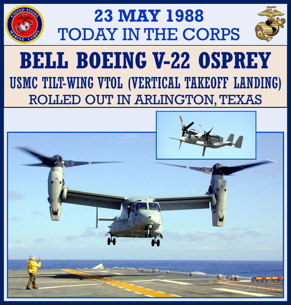 1988 â The V-22 Osprey, the worldâs first production tilt-rotor aircraft, made its debut during rollout ceremonies at Bell Helicopter
