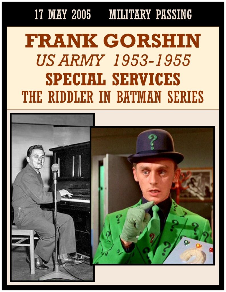 Frank John Gorshin Jr. (April 5, 1933 â May 17, 2005) was an American character actor, impressionist, and comedian. He […]