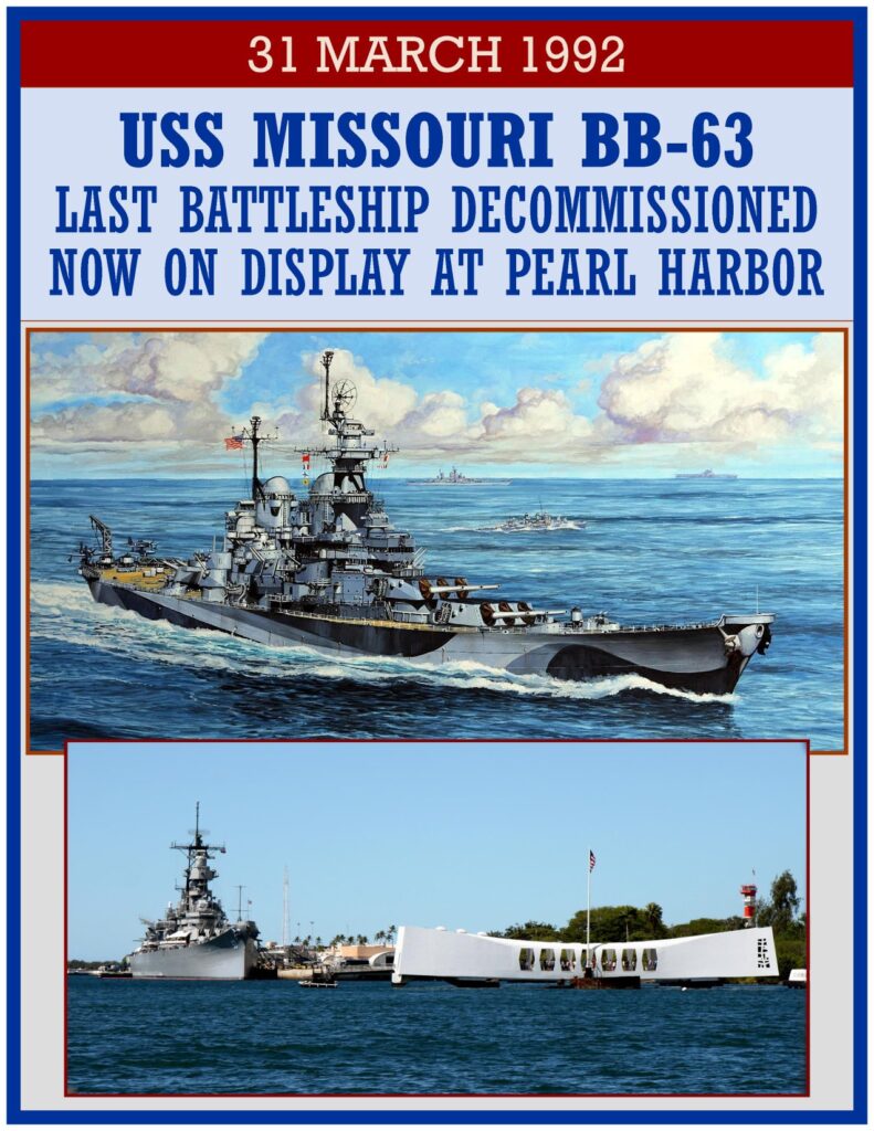 1992 â USS Missouri (BB-63), the last active American battleship is decommissioned. USS Missouri (BB-63) (âMighty Moâ or âBig Moâ)