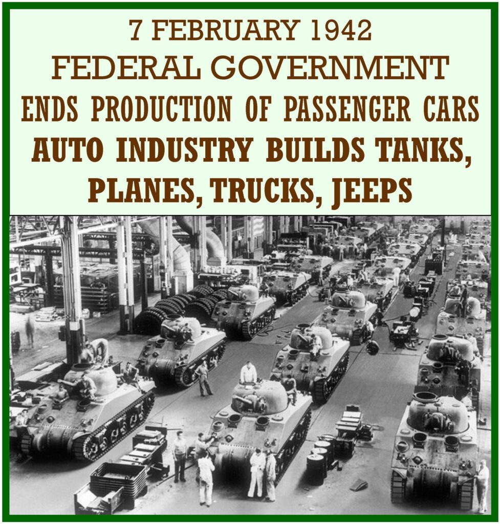 1942 â The federal government ordered passenger car production stopped and converted to wartime purposes. In spite of President Franklin