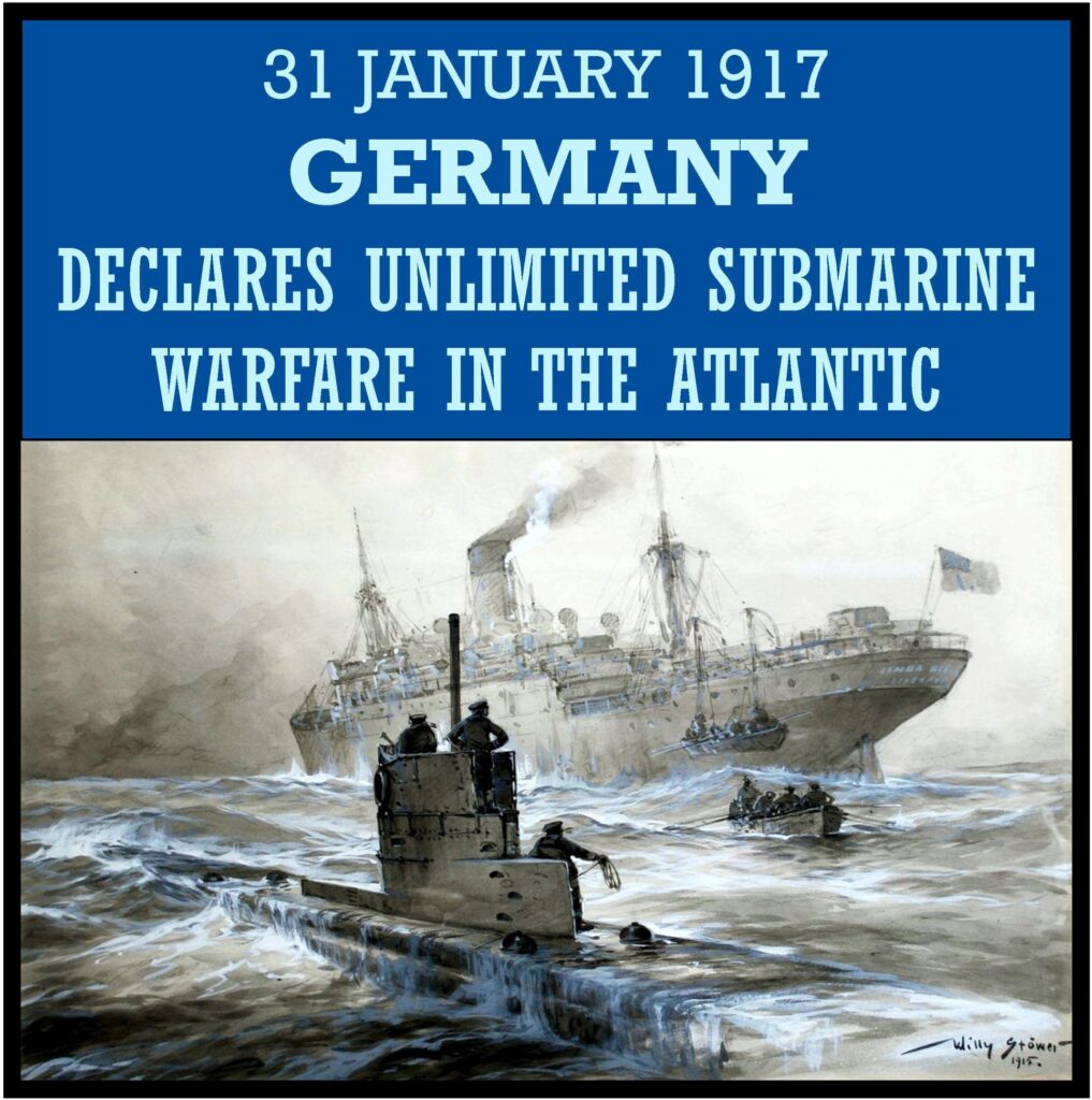 31 JANUARY 1917 â Germany announces the renewal of unlimited submarine warfare in the Atlantic, and German torpedo-armed submarines prepare