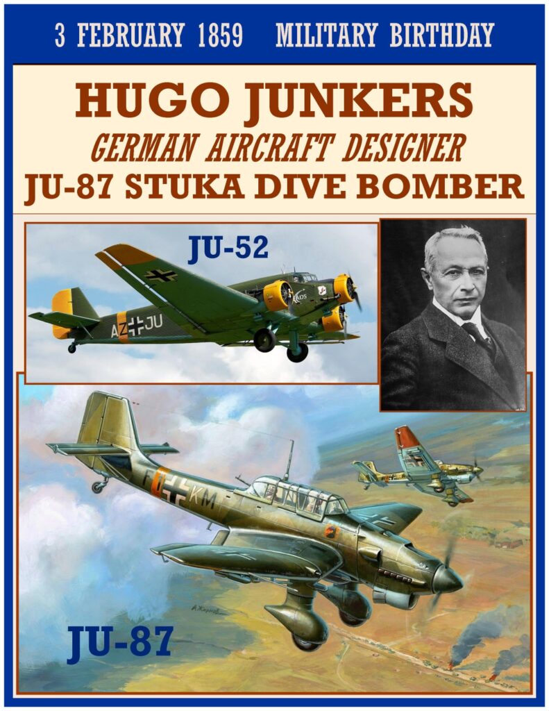 Hugo Junkers (3 February 1859 â 3 February 1935) was a German aircraft engineer and aircraft designer who pioneered the
