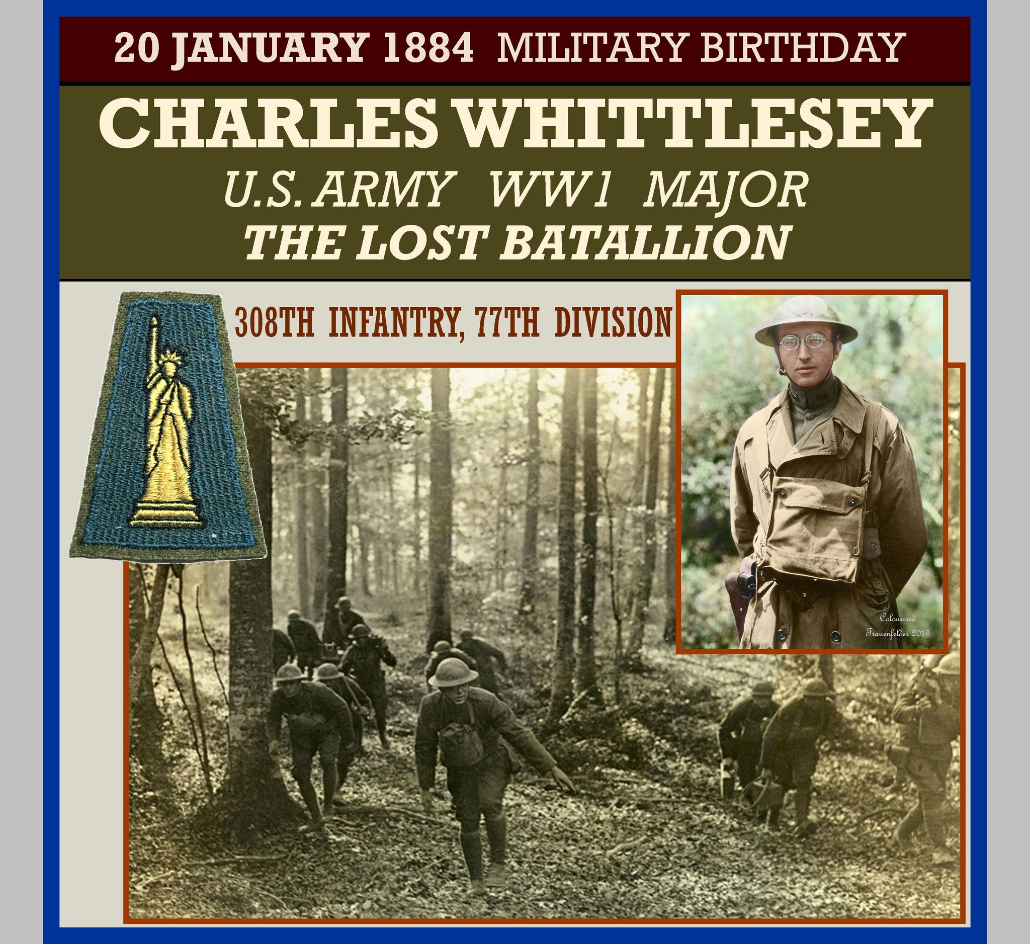 Charles White Whittlesey (born January 20, 1884; disappeared November 26, 1921) was a United States Army Medal of Honor recipient who led the “Lost Battalion” in the Meuse-Argonne Offensive during World War I. The Lost Battalion is the name given to the nine companies of the 77th Division, roughly 554 men, isolated by German forces during World War I after an American attack in the Argonne Forest in October 1918. The final casualty count lists 107 killed, 190 wounded, and 63 missing out of the 554 men who engaged in the defense. The U.S. Army award the Medal of Honor to three soldiers involved in the siege, including Major Whittlesey, who was also immediately given a battlefield promotion to lieutenant-colonel immediately. He was presumed to have committed suicide by drowning when he disappeared from a ship en route to Havana on November 26, 1921, at age 37.