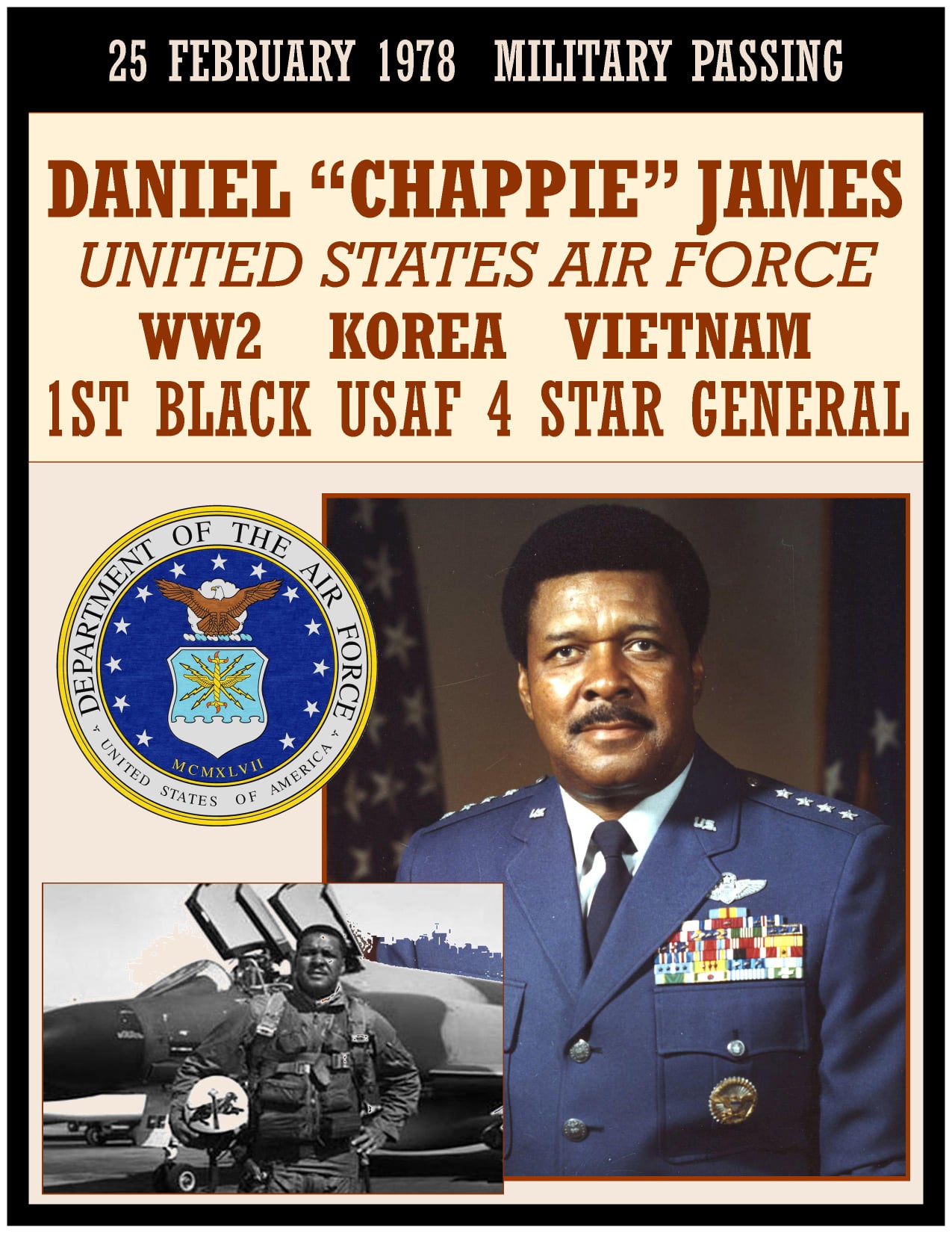 Daniel “Chappie” James Jr. (February 11, 1920 – February 25, 1978) was a fighter pilot in the United States Air Force who, in 1975, became the first African American to reach the rank of four-star general in the United States Armed Forces. Three years later James was forced to retire prematurely due to heart issues, and just a couple weeks after doing so he died of a heart attack.