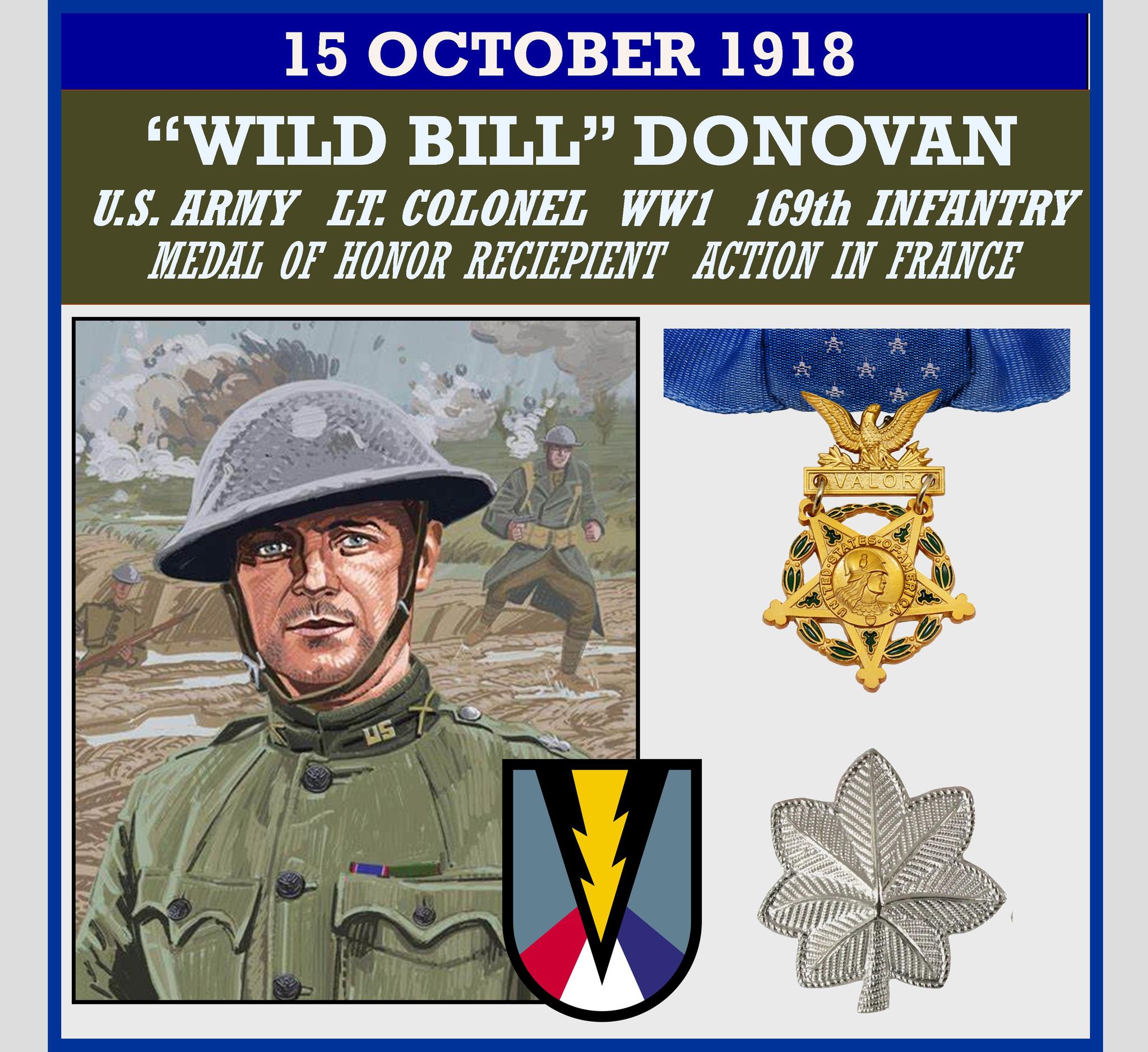 Rank and organization: Lieutenant Colonel, U.S. Army, 165th Infantry, 42d Division. Place and date: Near Landres-et-St. Georges, France, 14-15 October 1918. Entered service at: Buffalo, N.Y. Born: 1 January 1883, Buffalo, N.Y. G.O., No.: 56, W.D., 1922. Citation: Lt. Col. Donovan personally led the assaulting wave in an attack upon a very strongly organized position, and when our troops were suffering heavy casualties he encouraged all near him by his example, moving among his men in exposed positions, reorganizing decimated platoons, and accompanying them forward in attacks. When he was wounded in the leg by machine-gun bullets, he refused to be evacuated and continued with his unit until it withdrew to a less exposed position.