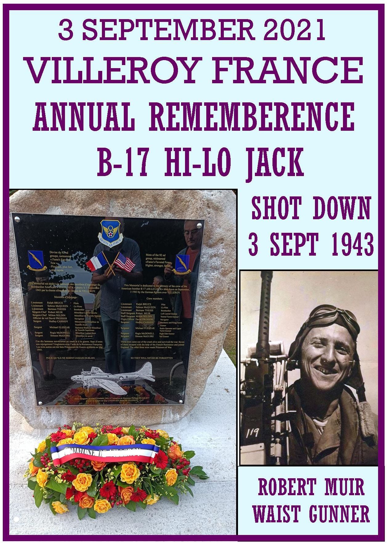 Each year in Villeroy, France, on 3 September a memorial service is held in commemoration of the B-17 Flying Fortress HI-LO JACK which was shot down in 1943. They come together to remember and thank the men who sacrificed to free them from the tyranny of Nazi Germany. They thank us and we thank them for keeping alive the memory of these heroes.