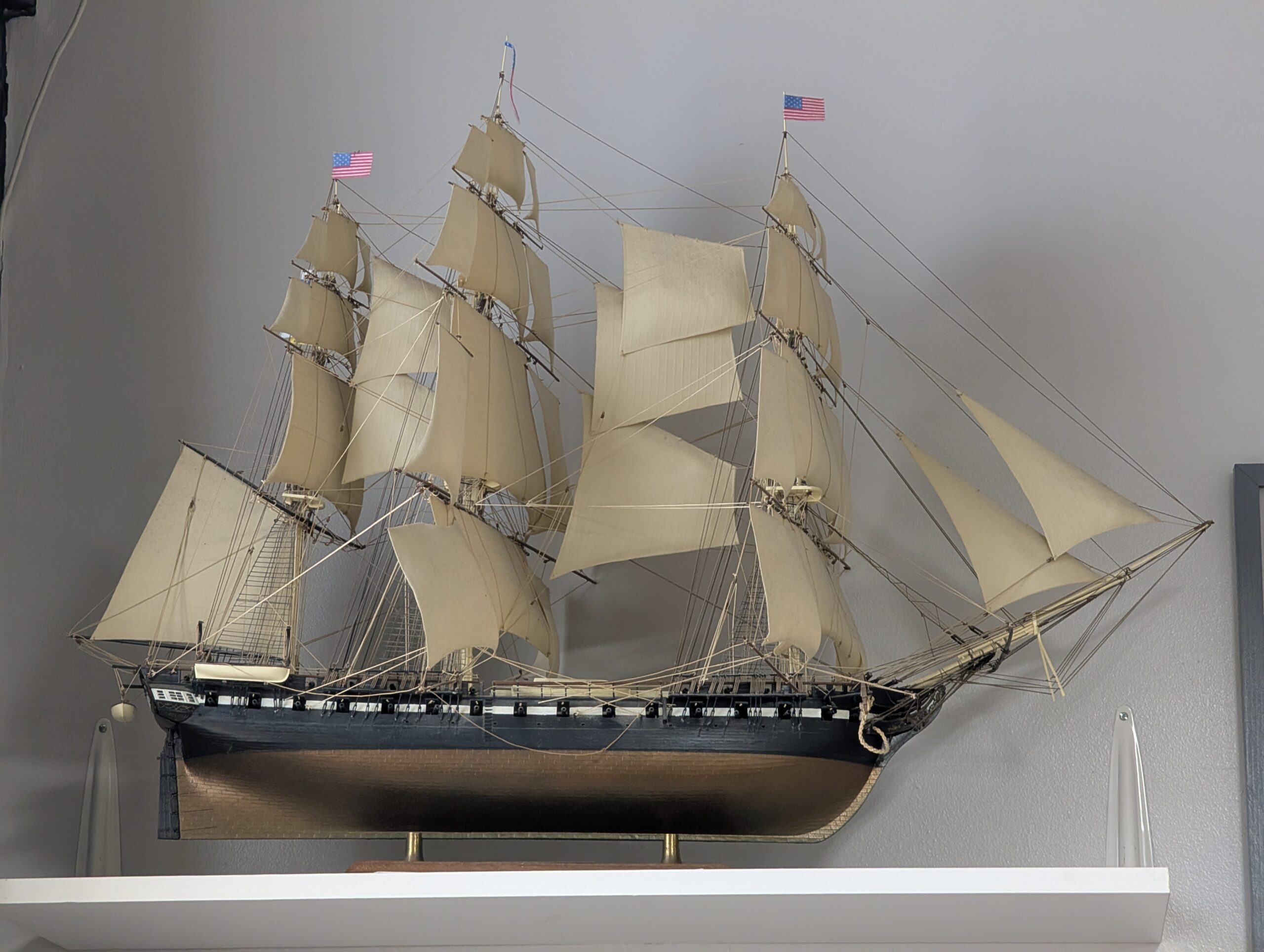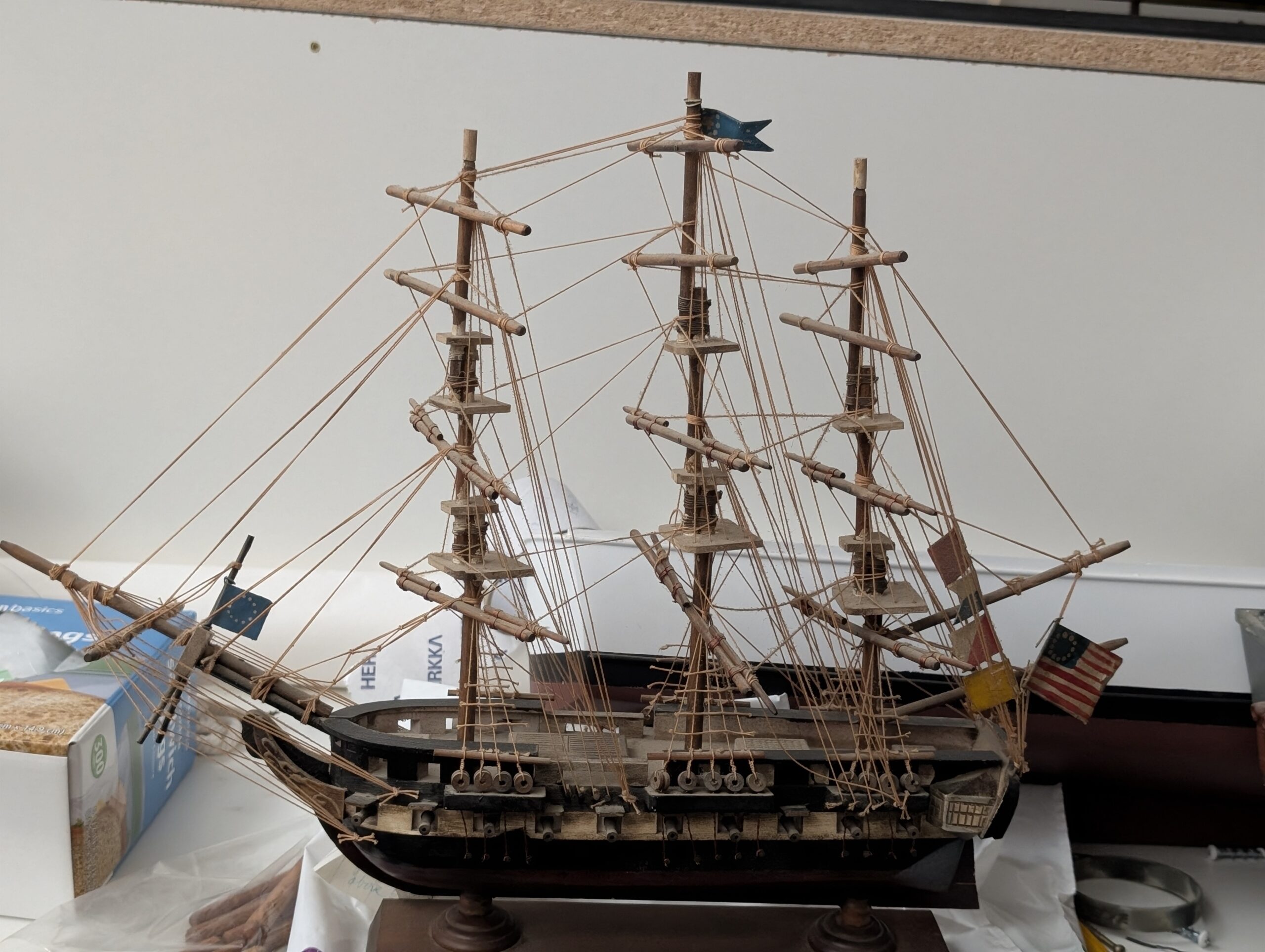 Another wooden model of an 18th or 19th-century sailing frigate, complete with intricate rigging and miniature flags, including an early American flag, further illustrates the beauty and functionality of these historical warships.