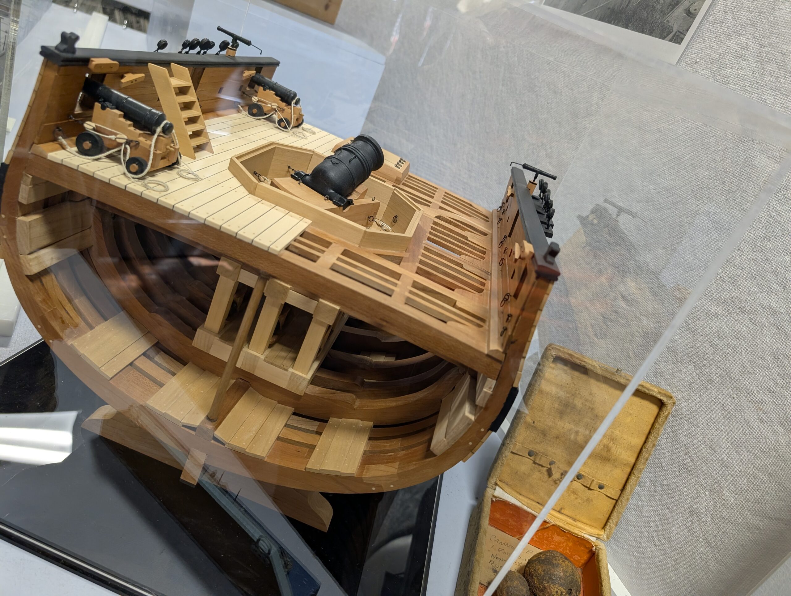 The deck of an 18th-century naval vessel, featuring functioning replica cannons, wooden ladders, and cannonballs, highlights the operational aspects of these early fighting ships.