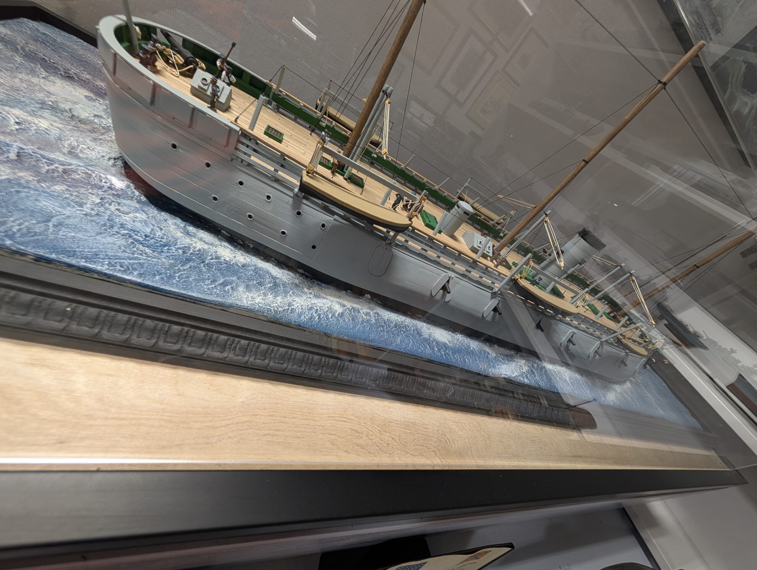 A scale model of a late 19th or early 20th-century warship, possibly a protected cruiser, displayed on a diorama depicting rough seas, captures the imposing presence of these early steel-hulled combatants.