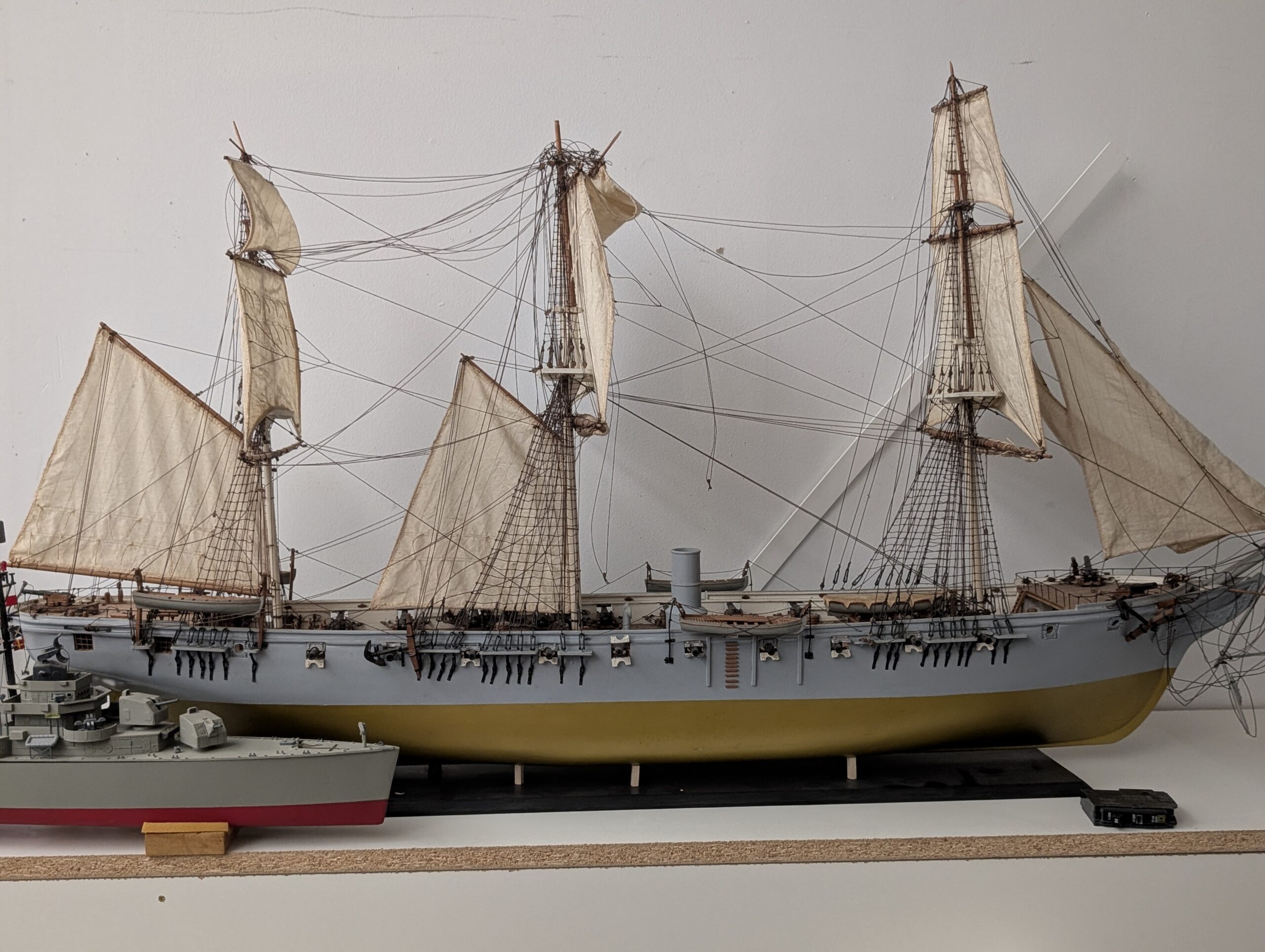 A detailed model of a 19th-century sailing frigate positioned alongside a modern destroyer model starkly illustrates the technological chasm crossed in naval design.