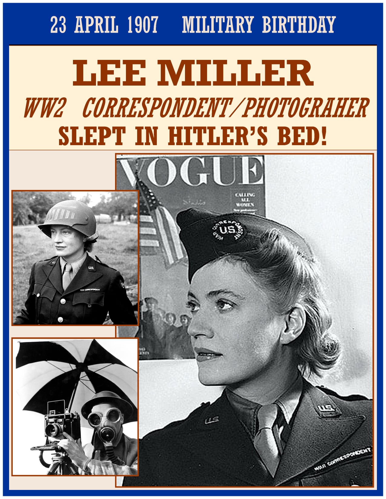 At the outbreak of World War II, Miller was living in Hampstead in London with Penrose when the bombing of the city began. Ignoring pleas from friends and family to return to the US, Miller embarked on a new career in photojournalism as the official war photographer for Vogue, documenting the Blitz. She was accredited with the U.S. Army as a war correspondent for Condé Nast Publications from December 1942. She teamed up with the American photographer David E. Scherman, a Life correspondent on many assignments. She traveled to France less than a month after D-Day and recorded the first use of napalm at the siege of St. Malo, as well as the liberation of Paris, the Battle of Alsace, and the horror of the Nazi concentration camps at Buchenwald and Dachau. Scherman’s photograph of Miller in the bathtub of Adolf Hitler’s apartment in Munich, with its shower hose looped in the center behind her head and the dust of Dachau on her boots deliberately dirtying Hitler’s bathroom, is one of the most iconic images from the MillerâScherman partnership, and occurred on April 30, 1945, coincidentally the same day as Hitler’s suicide. Being one of the first to arrive at Hitler’s secret apartments, Miller admits “I had his address in my pocket for years.” After taking the bathtub picture, Miller took a bath in the tub and slept in Hitler’s bed.