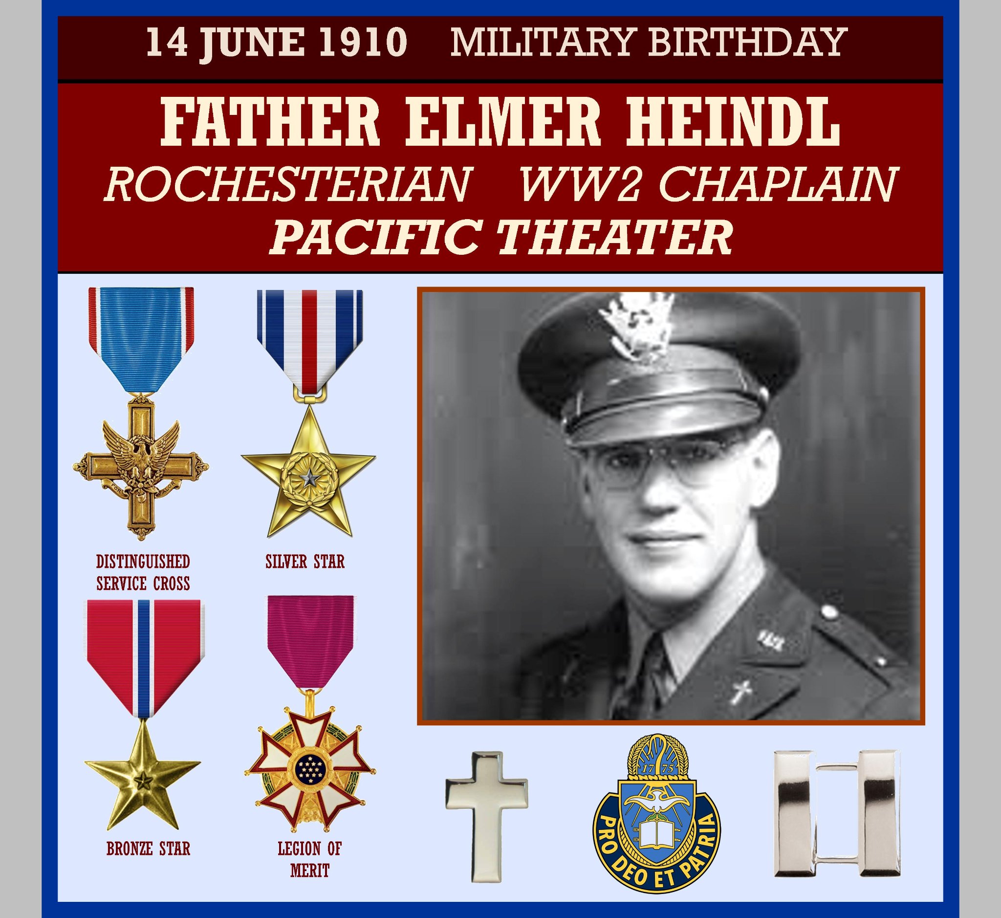 Heindl was born in Rochester, New York on June 14, 1910 to Florence May and William Casper Heindl. He was the oldest of 6 children and graduated from St. Andrew’s Preparatory Seminary and St. Bernard’s Seminary to become a Catholic priest on June 6, 1936. Enlisting in March 1942 as a US Army chaplain, Heindl served in the Pacific. He was decorated in 1943 for aiding US troops while under mortar fire, and in 1944 received the Bronze Star for helping bury American dead in the Solomon Islands, and was awarded the Silver Star a year later in the Philippines. Also in 1945 he was awarded the Distinguished Service Cross for “heroism under fire” in Manila on April 15, one of only 19 chaplains to have been awarded it. Heindl retrieved the body of an American casualty from a prison watchtower while under fire and then returned to rescue a wounded soldier with the aid of Private First Class Elmer Russell, who also received the Distinguished Service Cross. The two men gave aid to the dying soldier while continually under fire every time Russell used a flashlight to assess the injuries.[6] Two days later, on April 17, Heindl rescued American colonel Lawrence Kermit White, bringing him to an aid station while under fire. Of these actions he stated: “I went down there to do my duty as a chaplain, and that’s what saved me, the distinguished service cross doesn’t add one bit to my stature. Whatever happened was none of my doing whatsoever.”