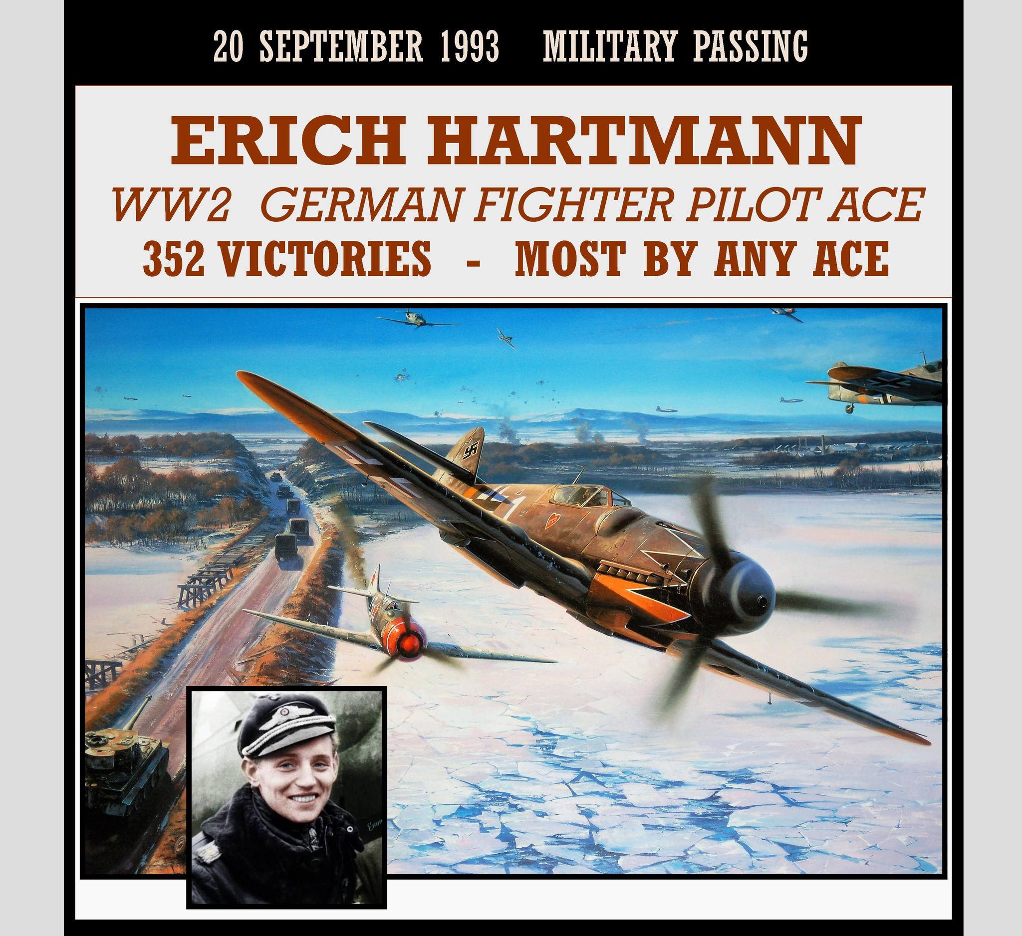 Erich Alfred Hartmann (19 April 1922 â 20 September 1993) was a German fighter pilot during World War II and the most successful fighter ace in the history of aerial warfare. He flew 1,404 combat missions and participated in aerial combat on 825 separate occasions. He was credited with shooting down a total of 352 Allied aircraft: 345 Soviet and seven American while serving with the Luftwaffe. During the course of his career, Hartmann was forced to crash-land his fighter 16 times due either to mechanical failure or damage received from parts of enemy aircraft he had shot down; he was never shot down by direct enemy action.