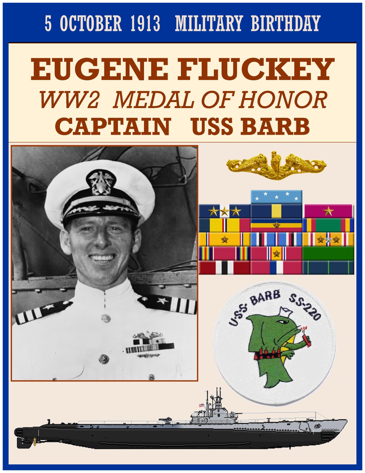 Eugene Bennett Fluckey (October 5, 1913 – June 28, 2007), nicknamed “Lucky Fluckey”, was a United States Navy rear admiral who received the Medal of Honor and four Navy Crosses during his service as a submarine commander in World War II.