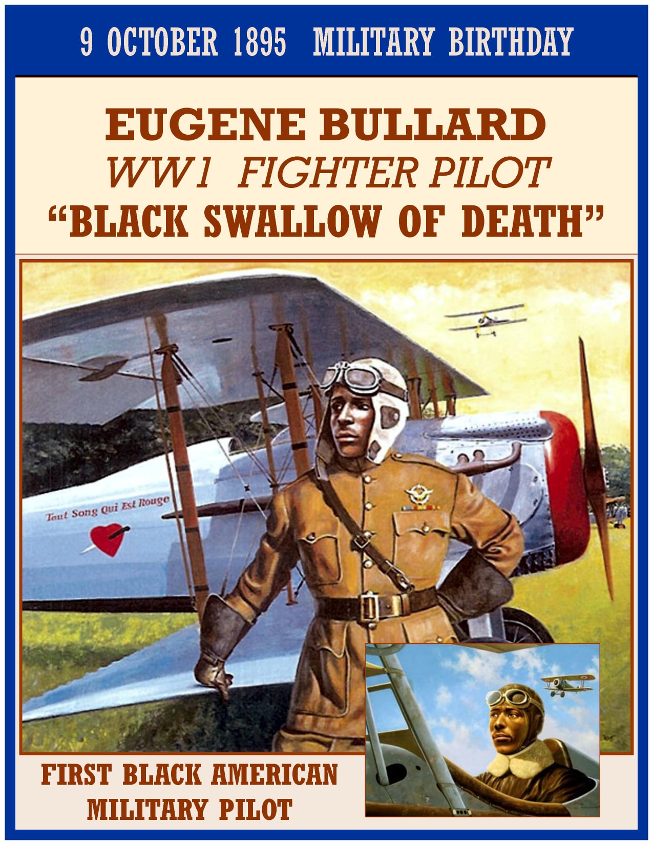 Eugene Jacques Bullard (October 9, 1895 â October 12, 1961), born Eugene James Bullard, was the first black American military pilot,[1][2] although Bullard flew for France not the United States. Bullard was one of the few black combat pilots during World War I, along with William Robinson Clarke, a Jamaican who flew for the Royal Flying Corps, Domenico Mondelli from Italy and Ahmet Ali Ãelikten of the Ottoman Empire. Also a boxer and a jazz musician, he was called “L’Hirondelle noire” in French, “Black Swallow”.