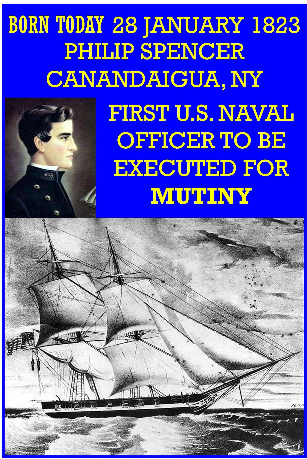 First U.S. Naval Officer Executed for Mutiny. Philip Spencer Born January 28, 1823 d. 1842 American naval officer. He was the first U.S. naval officer executed for mutiny. His father was President John Tyler’s Secretary of War at the time. Spencer joined the navy with the help of his father John C. Spencer the current U.S. Secretary of War. He twice assaulted an officer aboard the USS North Carolina while under the influence of alcohol. He was then reassigned to the USS John Adams, where he was involved in a drunken brawl with a Royal Navy officer while on shore leave. He attempted to avoid court-martial by resigning, but his resignation was rejected and he was reassigned to the USS Somers. He was then accused of forming a plan with two other sailors to seize the Somers and sail her as a pirate ship. The three men were hanged on the yardarm. The Somers affair was the inspiration for the Billy Budd character in Herman Melville’s novel Billy Budd, Sailor. Melville was the first cousin of an officer aboard the ship.