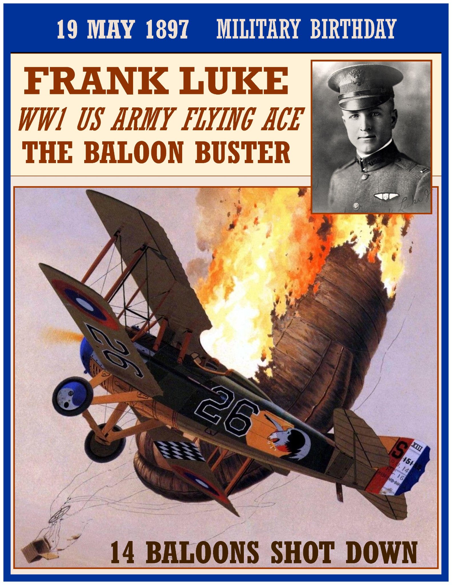 Between September 12 and September 29,1918, Luke was credited with shooting down 14 German balloons and four airplanes: Luke achieved these 18 victories during just 10 sorties in eight days, a feat unsurpassed by any pilot in World War I.