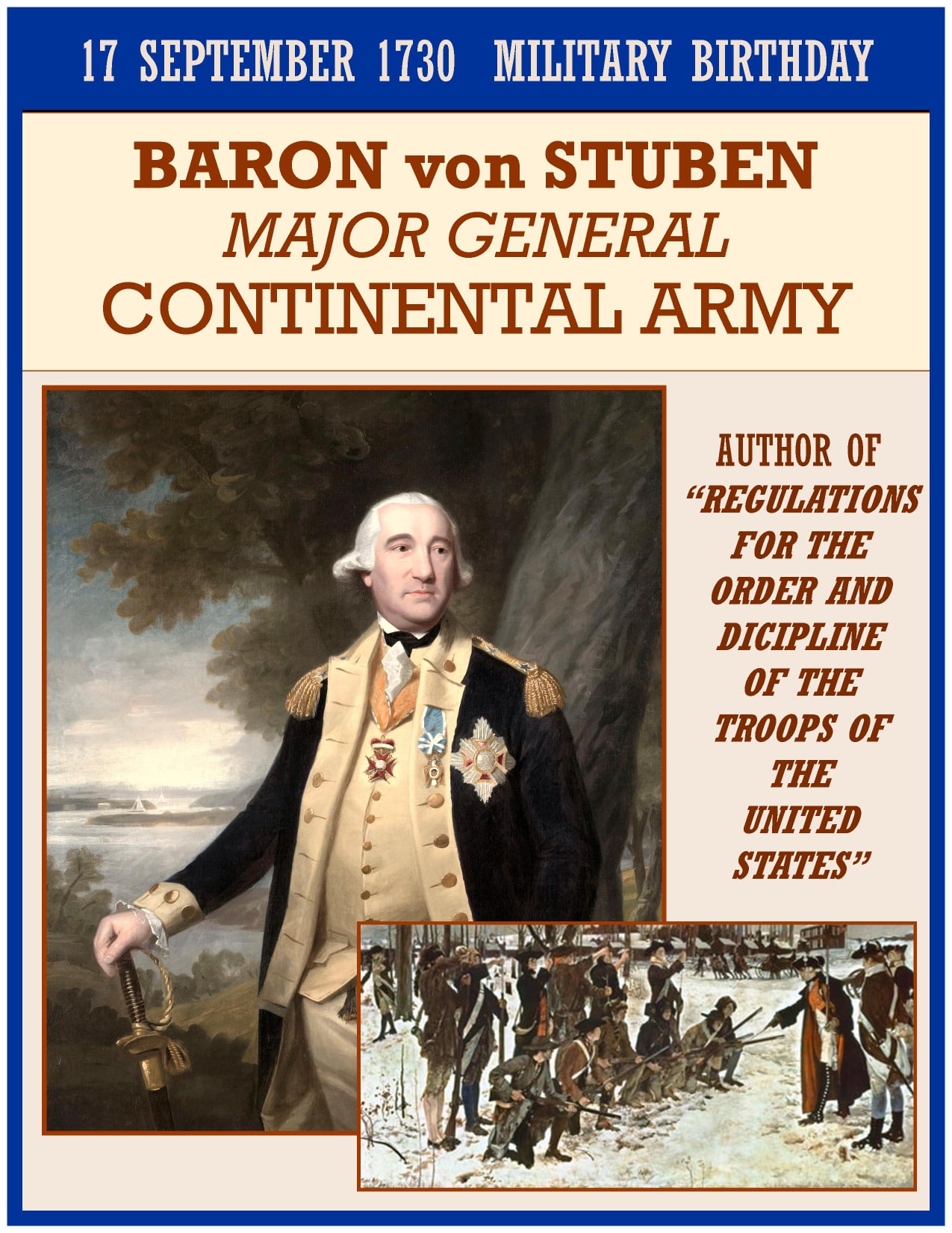 Friedrich Wilhelm August Heinrich Ferdinand von Steuben (born Friedrich Wilhelm Ludolf Gerhard Augustin von Steuben; September 17, 1730 â November 28, 1794), also referred to as Baron von Steuben), was a Prussian and later an American military officer. He served as Inspector General and a Major General of the Continental Army during the American Revolutionary War. He was one of the fathers of the Continental Army in teaching them the essentials of military drills, tactics, and discipline. He wrote Regulations for the Order and Discipline of the Troops of the United States, the book that served as the Army’s drill manual for decades. He served as General George Washington’s chief of staff in the final years of the war. In 1780, von Steuben was elected a member of the American Philosophical Society.
