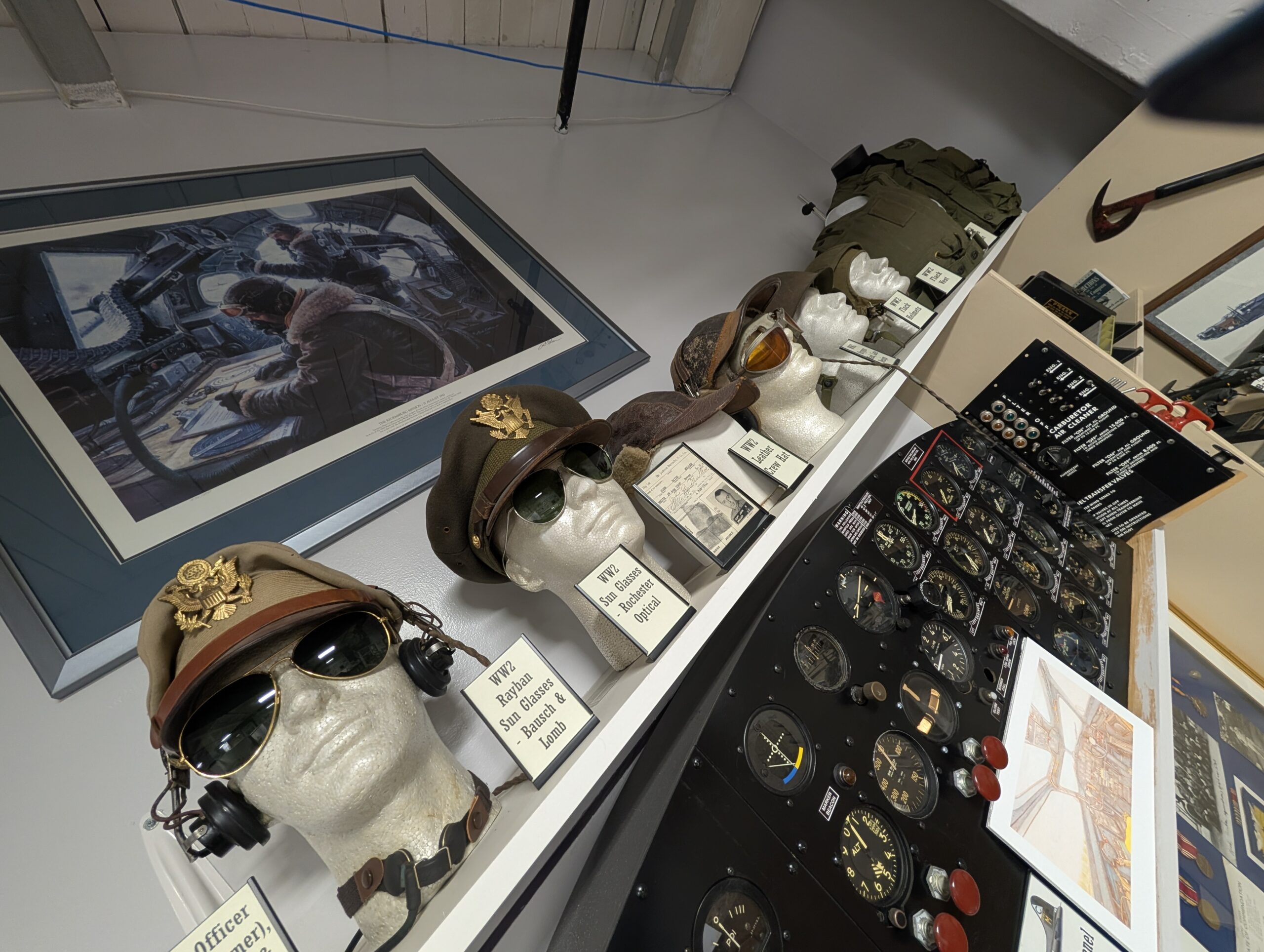 By World War II, a new domain of warfare had been established: the air. The equipment of the U.S. Army Air Forces (USAAF) aviator was a purpose-built system for survival and combat effectiveness in an unforgiving environment. The display showcases the evolution from the officer’s service cap to specialized flight helmets with integrated communications. Aviator sunglasses mitigated glare at high altitude, while heavy flak vests offered a measure of protection against anti-aircraft fire and enemy interceptors. This collection of gear—from headsets to instrument panels—underscores the complexity of aerial warfare and the emergence of the highly trained aviator as a central figure in modern military strategy.