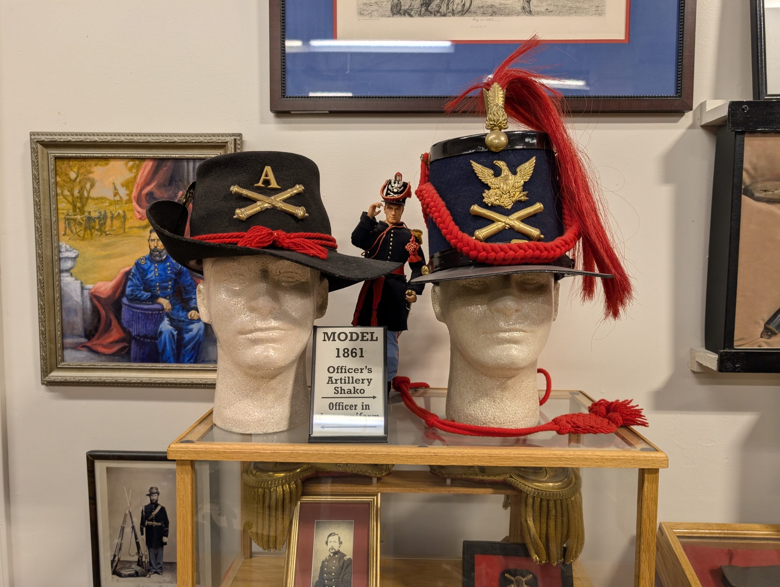 The headgear of a U.S. Army artillery officer during the Civil War reflects a service in transition. The Model 1861 Officer’s Artillery Shako, with its tall felt body, brass insignia, and prominent red plume, is a direct descendant of European military fashion, designed for battlefield grandeur and unit identification in the linear tactics of the era. Conversely, the more practical Hardee-style felt hat, adorned with the crossed cannon insignia of the artillery branch, represents an American adaptation to field conditions. While both were regulation, the contrast between the formal shako and the functional field hat illustrates the tension between traditional military ceremony and the harsh realities of industrial-scale conflict.