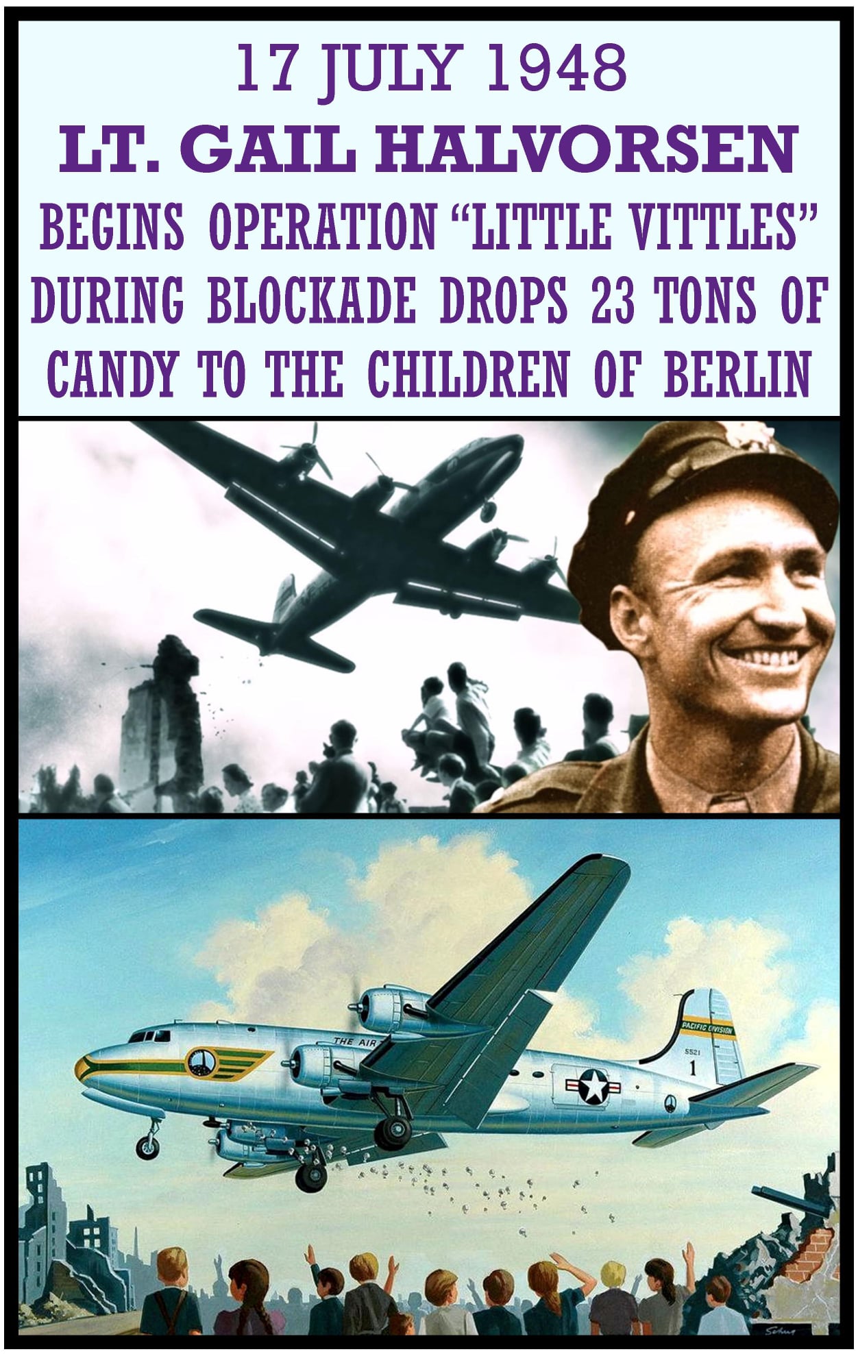 Gail Seymour “Hal” Halvorsen (born October 10, 1920) is a retired senior officer and command pilot in the United States Air Force. He is best known as the “Berlin Candy Bomber” or “Uncle Wiggly Wings” and gained fame for dropping candy to German children during the Berlin Airlift from 1948 to 1949.