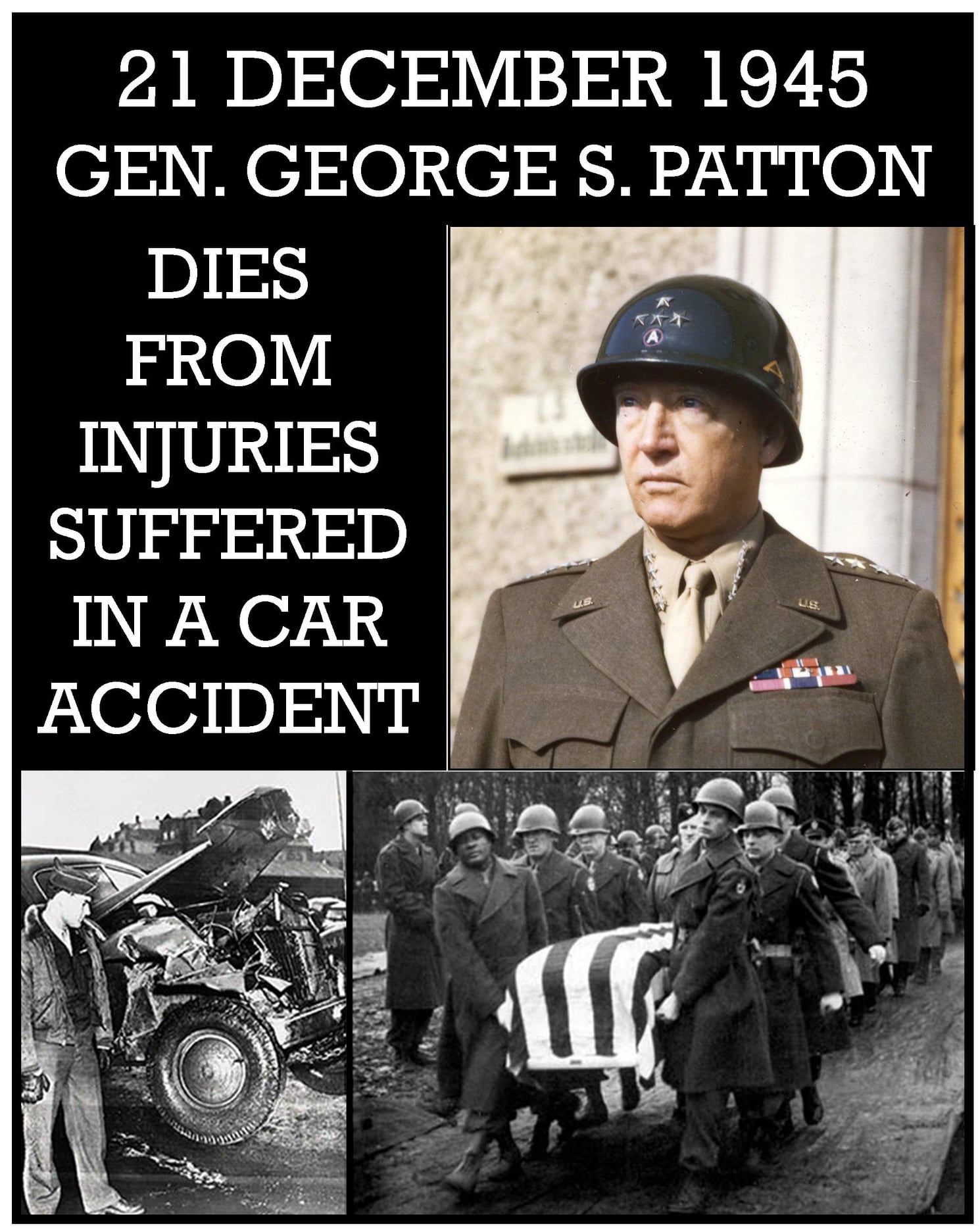 General George S. Patton, WW2 commander of the U.S. 3rd Army, dies from injuries suffered not in battle but in a freak car accident. He was 60 years old. Patton had many gifts, but diplomacy was not one of them. After the war, while stationed in Germany, he criticized the process of denazification, the removal of former Nazi Party members from positions of political, administrative, and governmental power. His impolitic press statements questioning the policy caused Eisenhower to remove him as U.S. commander in Bavaria. He was transferred to the 15th Army Group, but in December of 1945 he suffered a broken neck in a car accident and died less than two weeks later. rochestermilitary.com