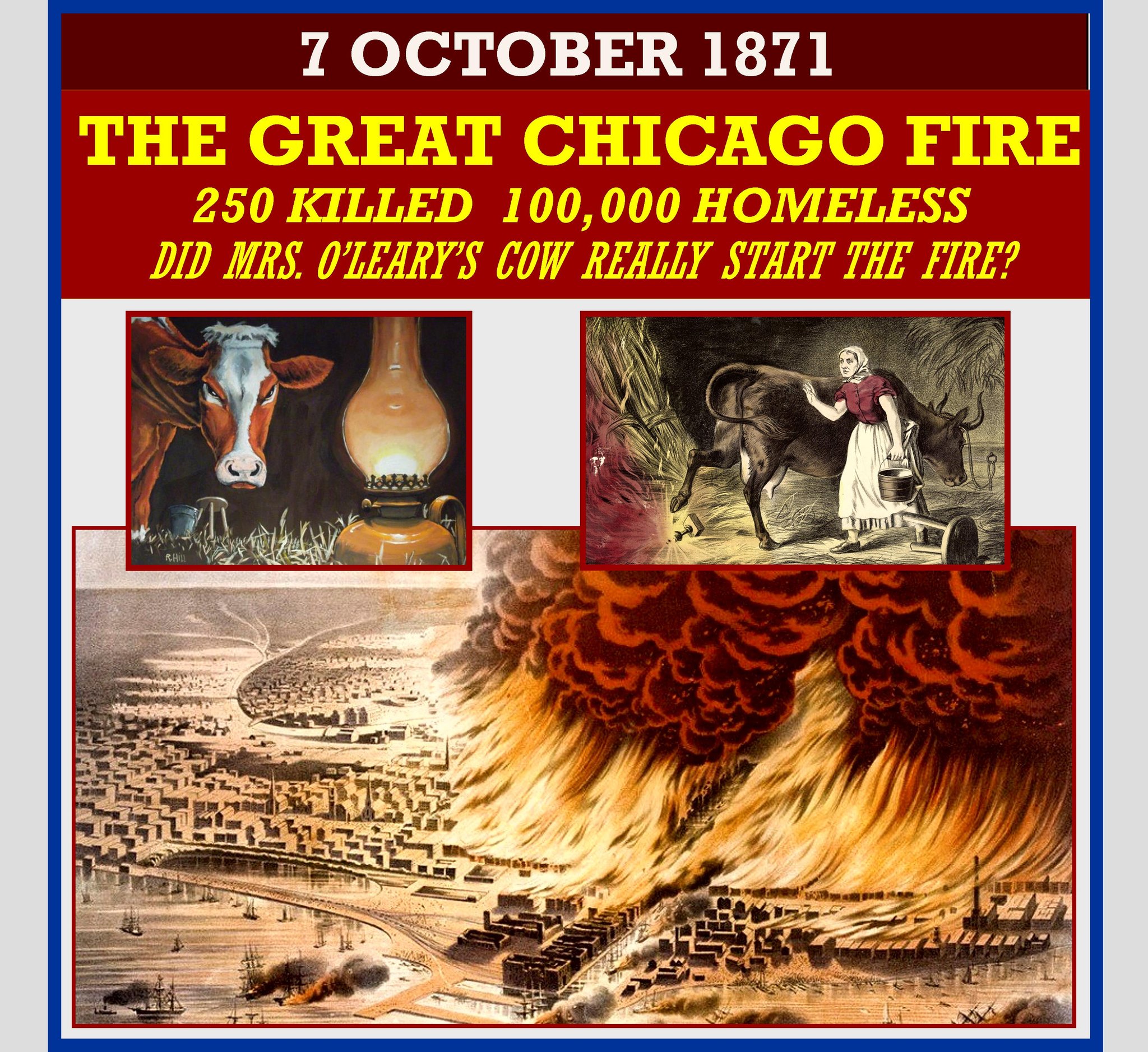 Great Chicago Fire – Not Started by a Cow! October 8, 1871 3.3 square miles of Chicago is destroyed, more than 250 people are killed, and 100,000 of the 300,000 residents were left homeless. Adding to the problem, Chicago had been in a drought, having received only 1 inch of rain since July 4. It was not Mrs. O’Leary’s cow that started the fire, even though this was reported in the Chicago Tribune’s first post-fire issue. Twenty-two years later, the author of the story retracted it, stating it was fabricated. The fire started at about 9:00 p.m. near a barn belonging to the O’Leary family. The O’Learys claim they were already asleep and not milking the cow as the article claimed. City officials never determined the exact cause of the fire, but it’s possible that a group of men who were gambling inside the barn knocked over a lantern.