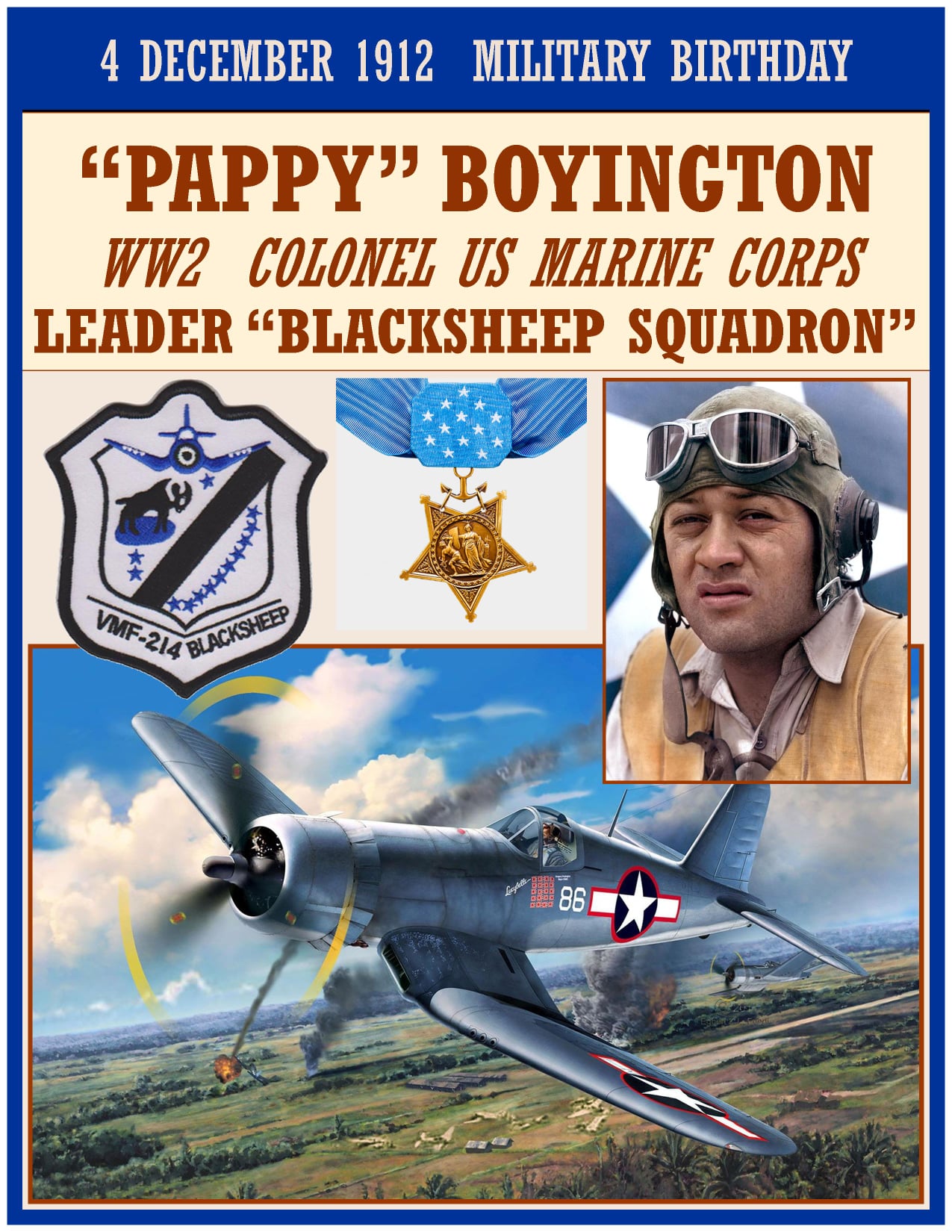 Gregory “Pappy” Boyington (December 4, 1912 â January 11, 1988) was an American combat pilot who was a United States Marine Corps fighter ace during World War II. He received the Medal of Honor and the Navy Cross. A Marine aviator with the Pacific fleet in 1941, Boyington joined the “Flying Tigers” (1st American Volunteer Group) of the Republic of China Air Force and saw combat in Burma in late 1941 and 1942 during the military conflict between China and Japan.