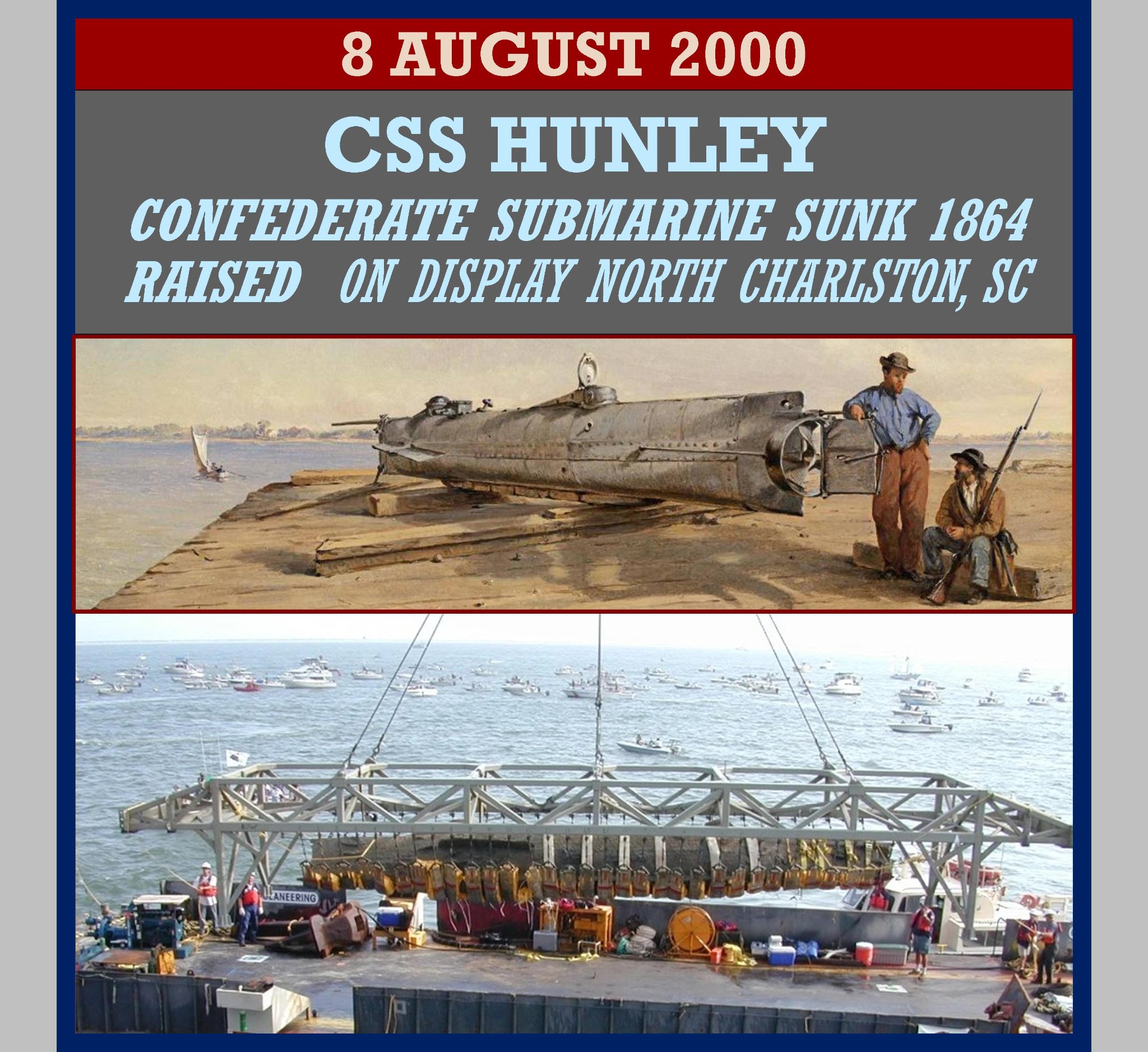 Finally located in 1995, Hunley was raised in 2000, and is on display in North Charleston, South Carolina, at the Warren Lasch Conservation Center on the Cooper River. Examination in 2012 of recovered Hunley artifacts suggests that the submarine was as close as 20 ft to her target, Housatonic, when her deployed torpedo exploded, which caused the submarine’s own loss.