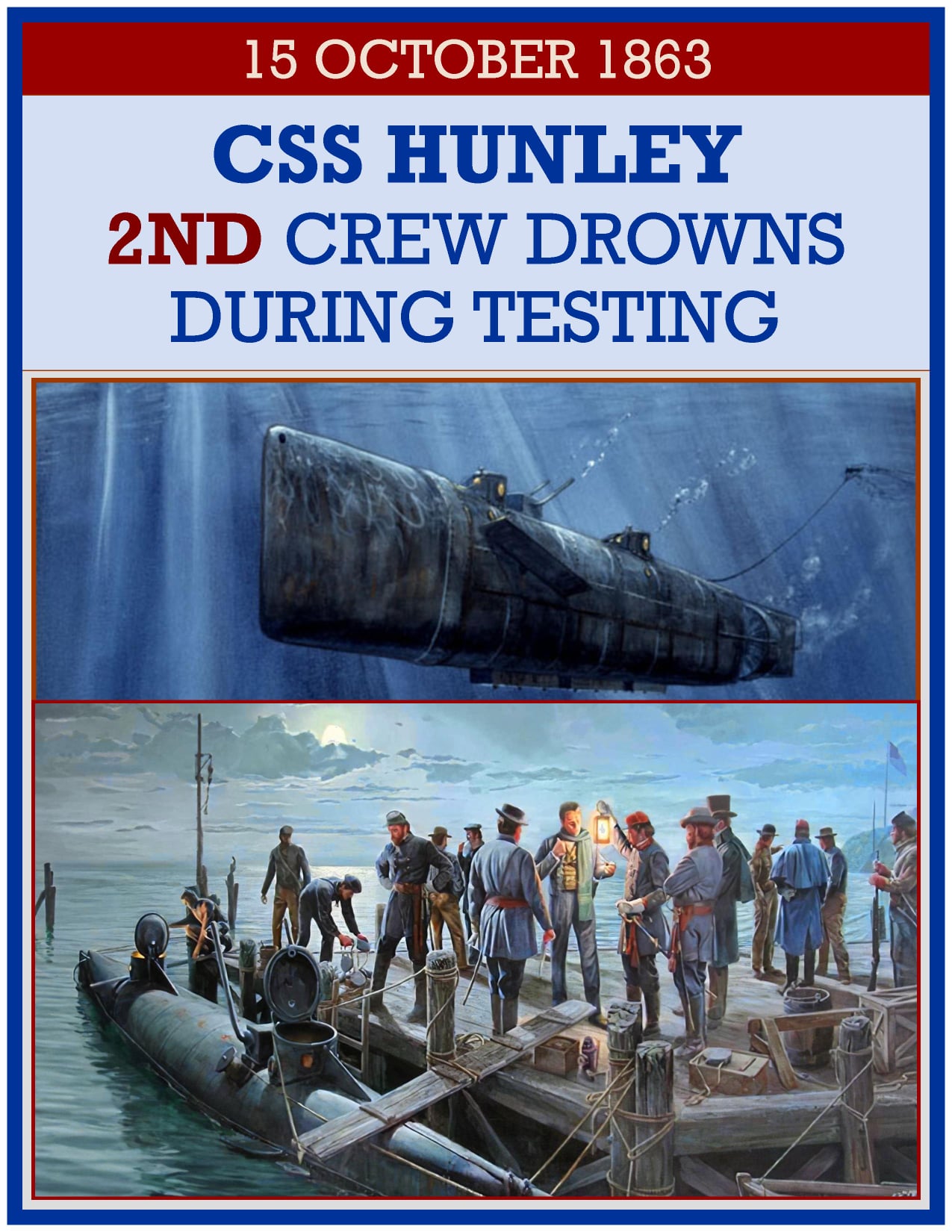 On 17 February 1864, Hunley attacked and sank the 1,240-displacement ton United States Navy[2] screw sloop-of-war Housatonic, which had been on Union blockade-duty in Charleston’s outer harbor. Hunley did not survive the attack and also sank, taking with her all eight members of her third crew, and was lost.