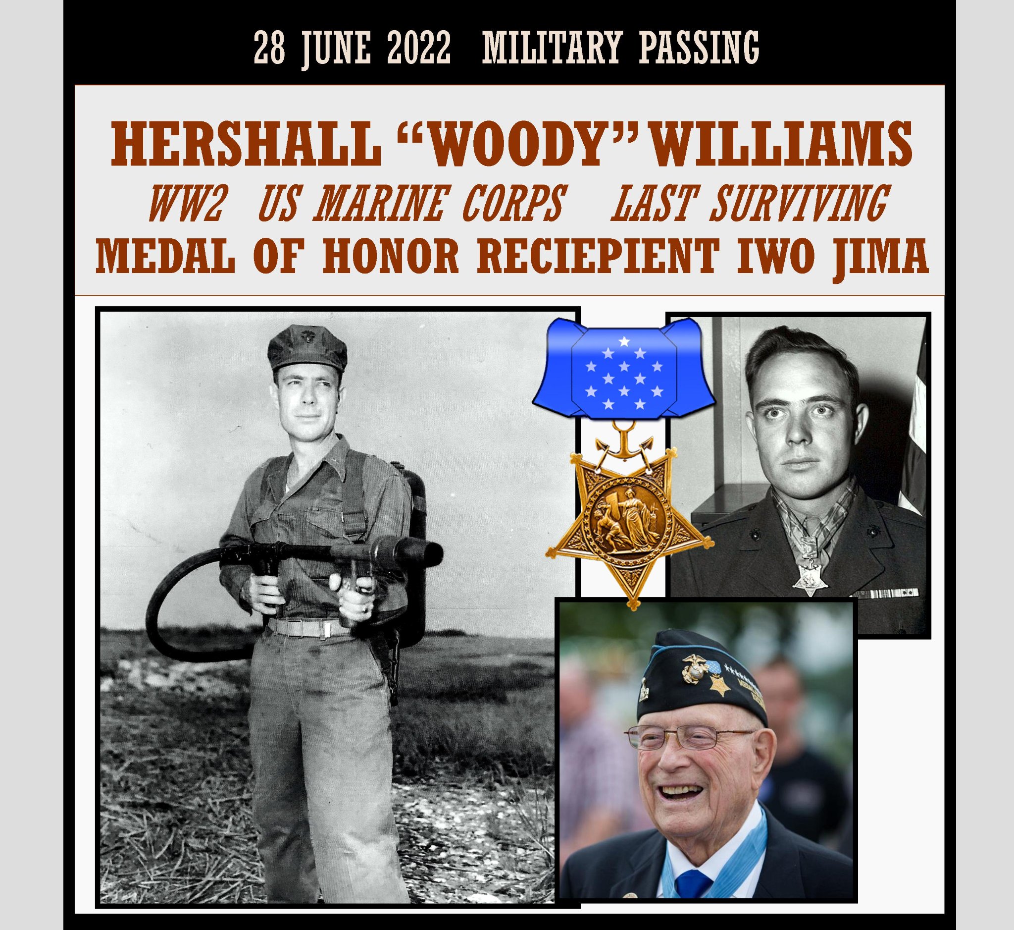 Hershel Woodrow âWoodyâ Williams (October 2, 1923 â June 28, 2022) was a United States Marine Corps warrant officer and United States Department of Veterans Affairs veterans service representative who received the United States military’s highest decoration for valorâthe Medal of Honorâfor heroism above and beyond the call of duty during the Battle of Iwo Jima in World War II. At the time of his death, Williams was the last living Medal of Honor recipient from World War II.