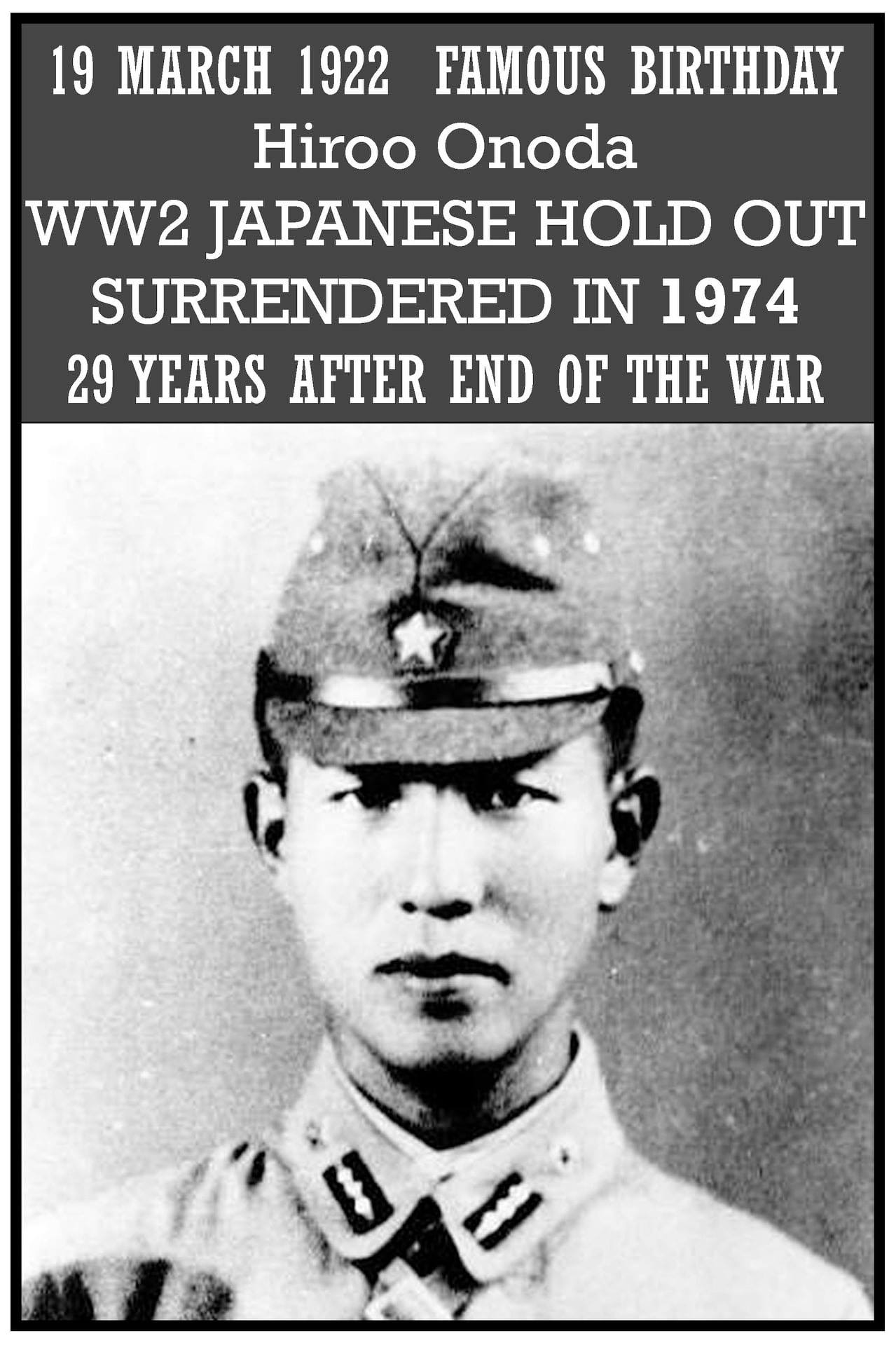 Hiroo Onoda (Japanese: å°éç° å¯é, 19 March 1922 â 16 January 2014) was an Imperial Japanese Army intelligence officer who fought in World War II and was a Japanese holdout who did not surrender at the war’s end in August 1945. After the war ended Onoda spent 29 years hiding out in the Philippines until his former commander travelled from Japan to formally relieve him from duty by order of Emperor ShÅwa in 1974. He held the rank of second lieutenant in the Imperial Japanese Army.