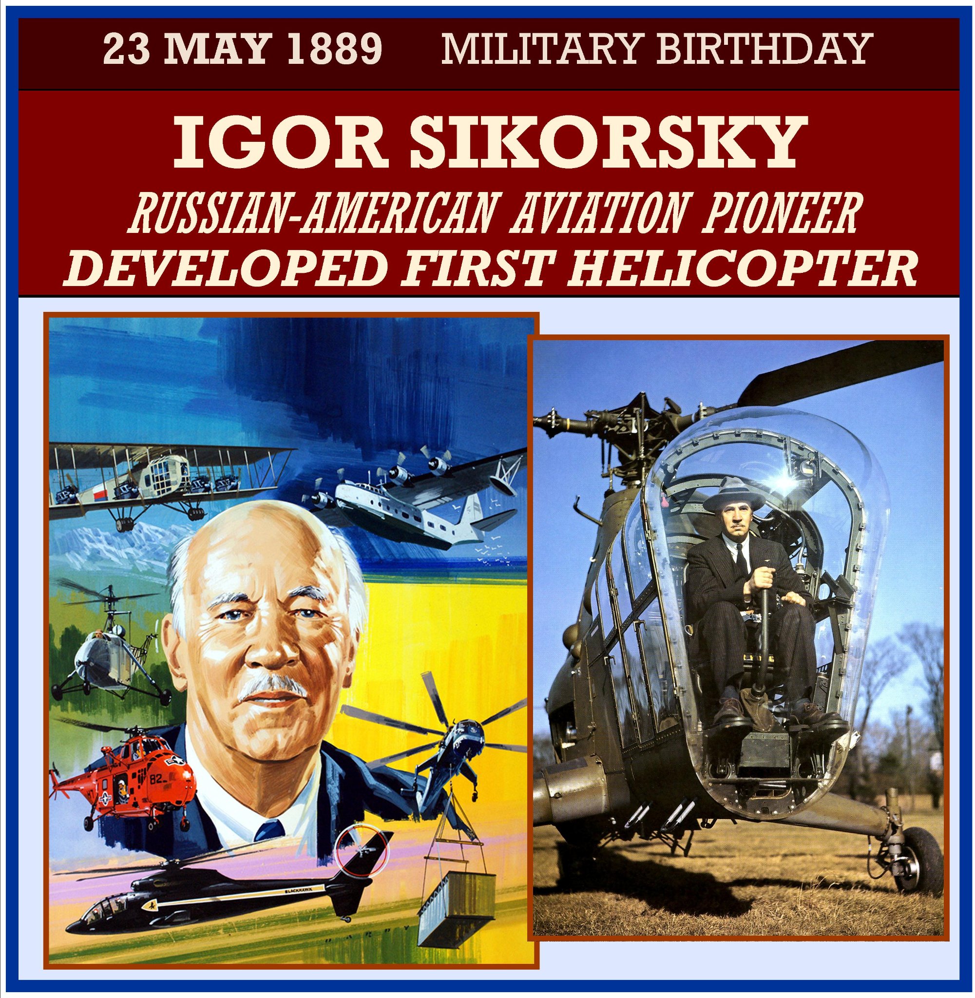 Igor Ivanovich Sikorsky (May 25, 1889 â October 26, 1972) was a RussianâAmerican aviation pioneer in both helicopters and fixed-wing aircraft. His first success came with the S-2, the second aircraft of his design and construction. His fifth airplane, the S-5, won him national recognition as well as F.A.I. license number 64. His S-6-A received the highest award at the 1912 Moscow Aviation Exhibition, and in the fall of that year the aircraft won first prize for its young designer, builder and pilot in the military competition at Saint Petersburg.
