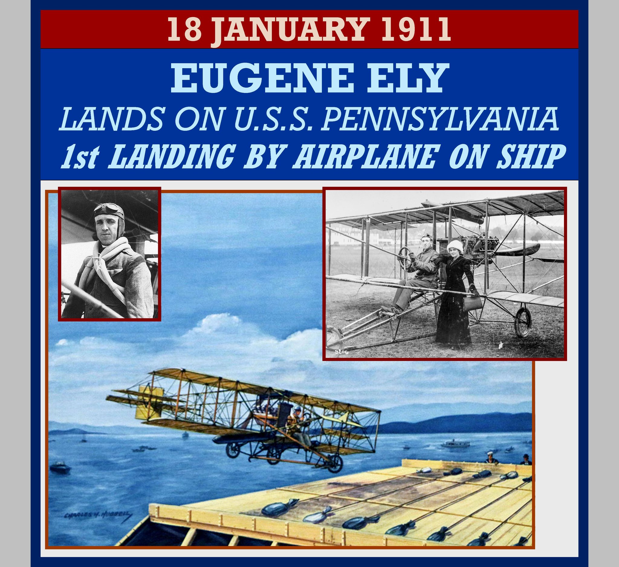 In 1910 Eugene B. Ely took off from the USS Birmingham. Taking off a ship was one thing. Landing on one was quite another. Despite the somewhat harrowing flight off the Birmingham, Ely was ready to try. With Ely and the Curtiss team scheduled to fly in San Francisco in January, Chambers made arrangements for the attempt on the west coast. The armored cruiser USS Pennsylvania was prepared and anchored in San Francisco Bay. This time a longer platform was in place, 120 feet, along with ropes and sandbags stretched across to serve as a crude arresting system for landing. There was also a canvas awning at the end to catch the airplane if the ropes and sandbags were not sufficient. With longer wings and hooks on the landing gear, and Ely donning a padded football helmet and bicycle inner tubes around his body in case anything went awry, all was ready on the morning of January 18, 1911. Crowds lined the shore and boats collected in the harbor to witness the daring flight. At 11:00 a.m., Ely took off from nearby Tanforan Race Track and headed for the Pennsylvania. To the delight of thousands of spectators, Ely made a safe landing, the arresting equipment working perfectly. After lunch with the shipâs captain and a few photographs, the platform was cleared and the Pennsylvania was pointed into the wind. Ely took off, flew past the crowd, and landed safely back at Tanforan. Naval aviation was born.