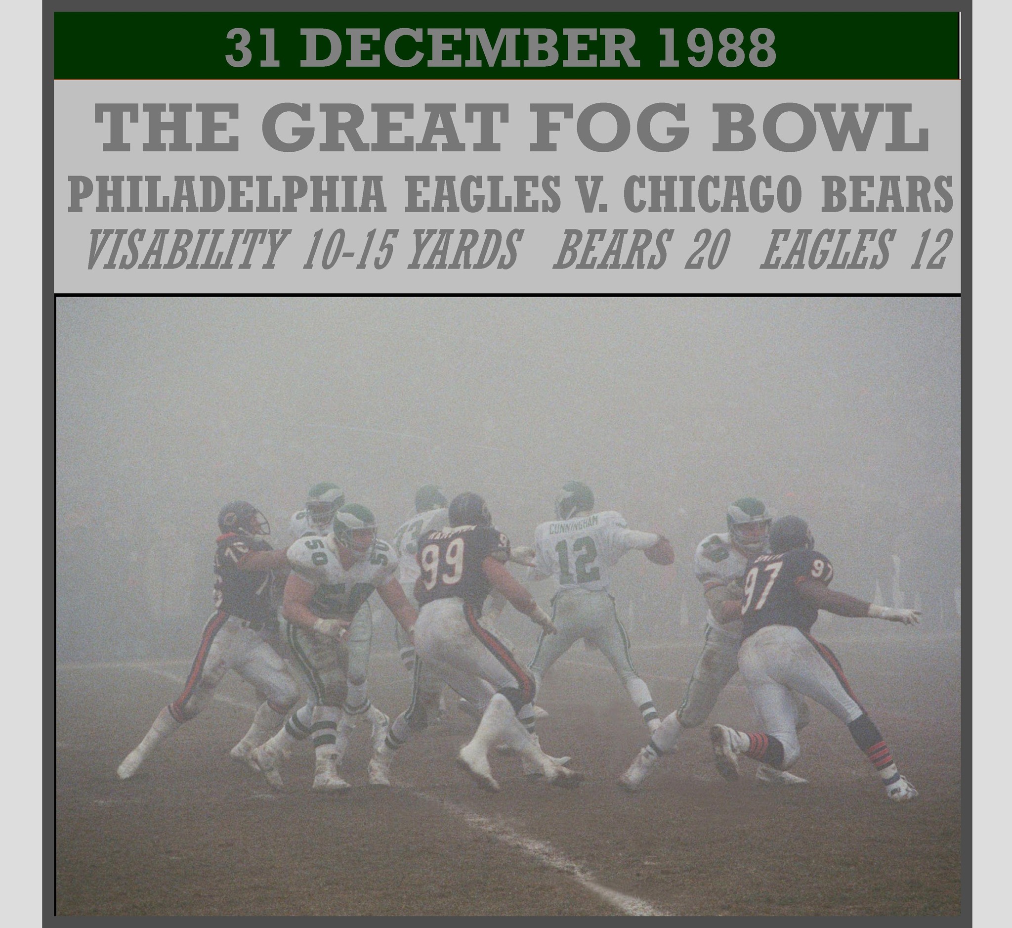 In American football, the Fog Bowl was the December 31, 1988 National Football League (NFL) playoff game between the Philadelphia Eagles and Chicago Bears. A dense fog rolled over Chicago’s Soldier Field during the 2nd quarter, cutting visibility to about 15â20 yards for the rest of the game. The Eagles moved the ball effectively all game and their quarterback Randall Cunningham recorded 407 passing yards despite the low visibility; but they could not advance the ball into the end zone. Many players complained that they could not see the sidelines or first-down markers. The Bears ended up winning the game by a score of 20â12. The game eventually was named #3 on NFL Top 10’s Weather Games.