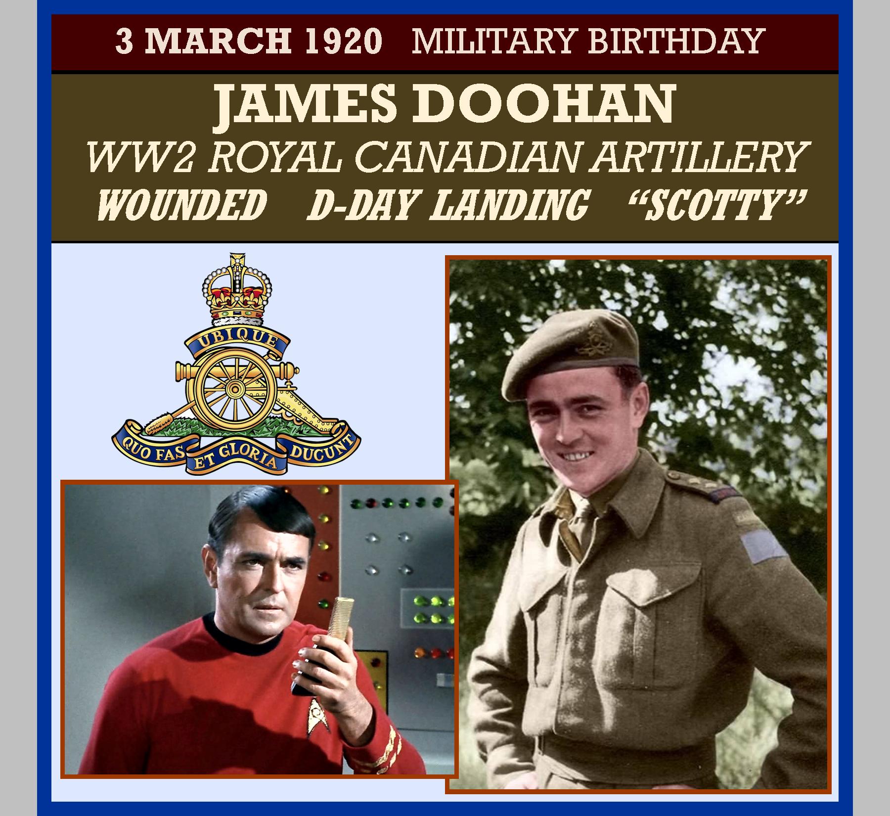 Before James Montgomery Doohan was well known for his portrayal of a Scottish engineer on Star Trek, he was a lieutenant in World War II. During his service in the Canadian Royal Army, Montgomery served in the 14th Field Artillery Regiment in the 3rd Canadian Infantry Division. While participating in the notorious D-Day battle on June 6th, 1944, Montgomery navigated a minefield with his fellow soldiers between command posts on Juno beach, and he was shot multiple times.