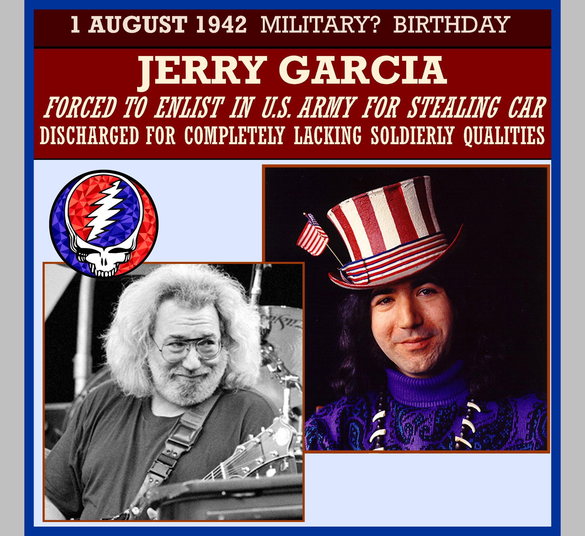 Jerry Garcia’s official military personnel file says the guitarist was “unreliable, irresponsible, immature, unwilling to accept authority and completely lacking in soldierly qualities.” This led to his discharge from the Army in 1960 just eight months after he enlisted.