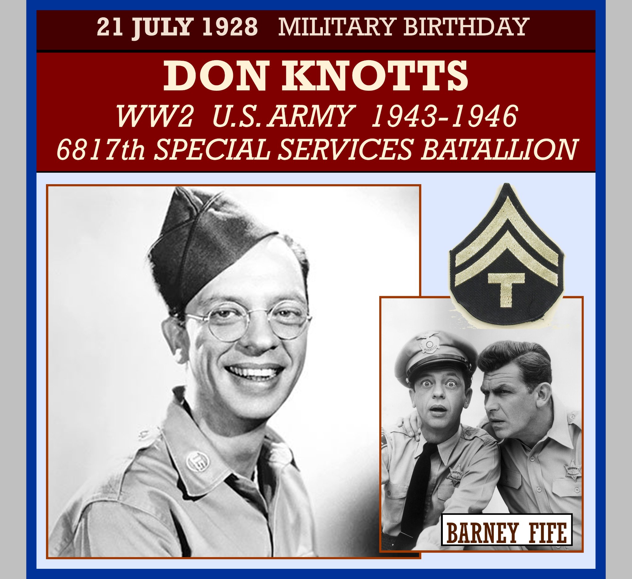 Knotts served in the army from June 21, 1943, to January 6, 1946, in the Army’s 6817th Special Services Battalion. He was discharged at the rank of Technician Grade 5, then equivalent to a corporal. During his service, he was awarded the World War II Victory Medal, the Philippine Liberation Medal, the Asiatic–Pacific Campaign Medal (with 4 bronze service stars), the American Campaign Medal, the Army Good Conduct Medal, the Army Marksman Badge (with an M1 Carbine) and the Honorable Service Lapel Pin.