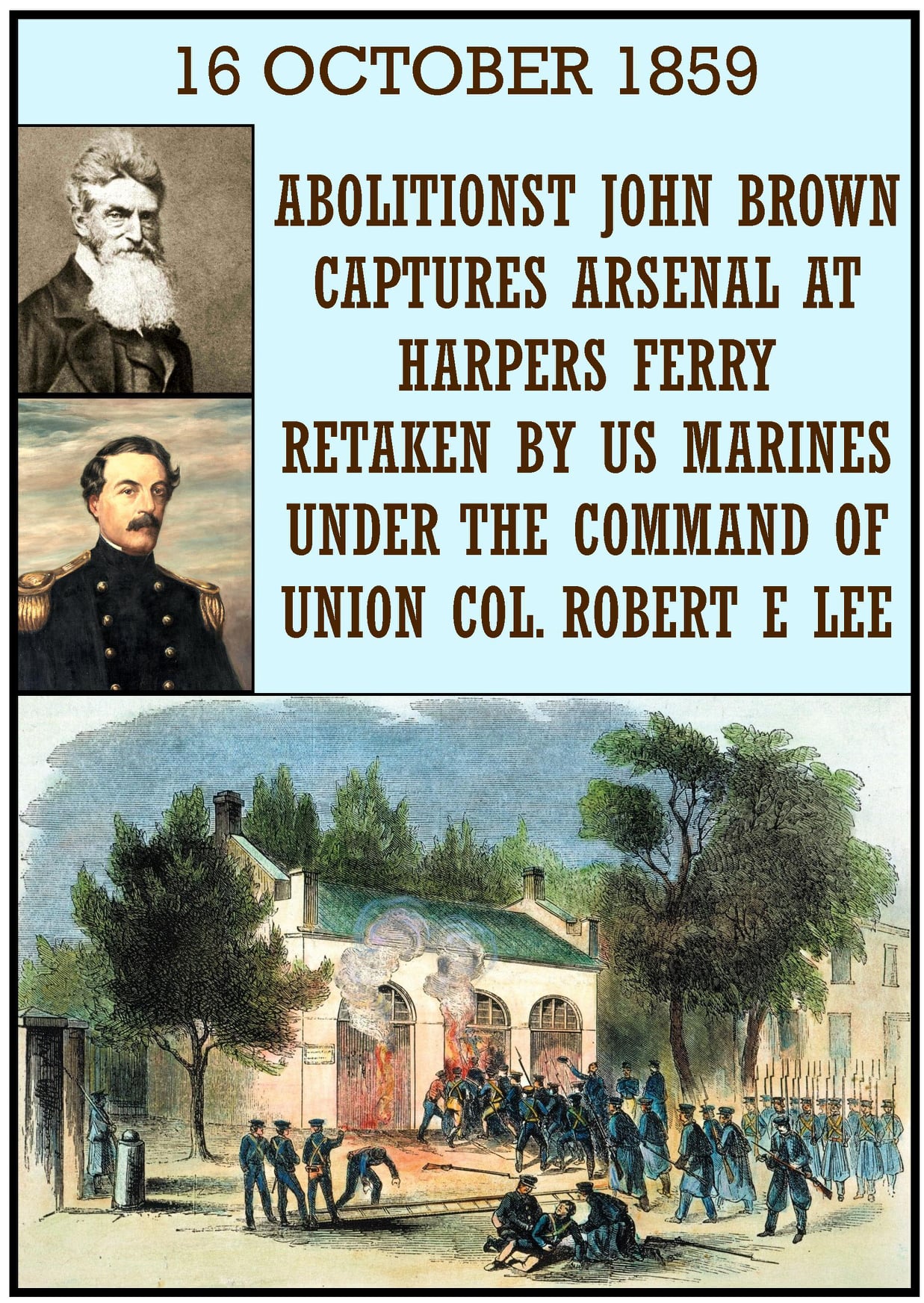 John Brown’s raid on Harpers Ferry was an effort by abolitionist John Brown, from October 16 to 18, 1859, to initiate a slave revolt in Southern states by taking over the United States arsenal at Harpers Ferry, Virginia. It has been called the dress rehearsal for or Tragic Prelude to the Civil War. Brown’s party of 22 was defeated by a company of U.S. Marines, under the overall command of Colonel Robert E. Lee. Other soon to be Confederates were Stonewall Jackson and Jeb Stuart who were part of the troops guarding the arrested Brown, and John Wilkes Booth was a spectator at his execution. John Brown had originally asked Harriet Tubman and Frederick Douglass, both of whom he had met in his transformative years as an abolitionist in Springfield, Massachusetts, to join him in his raid, but Tubman was prevented by illness and Douglass declined, as he believed Brown’s plan was suicidal.