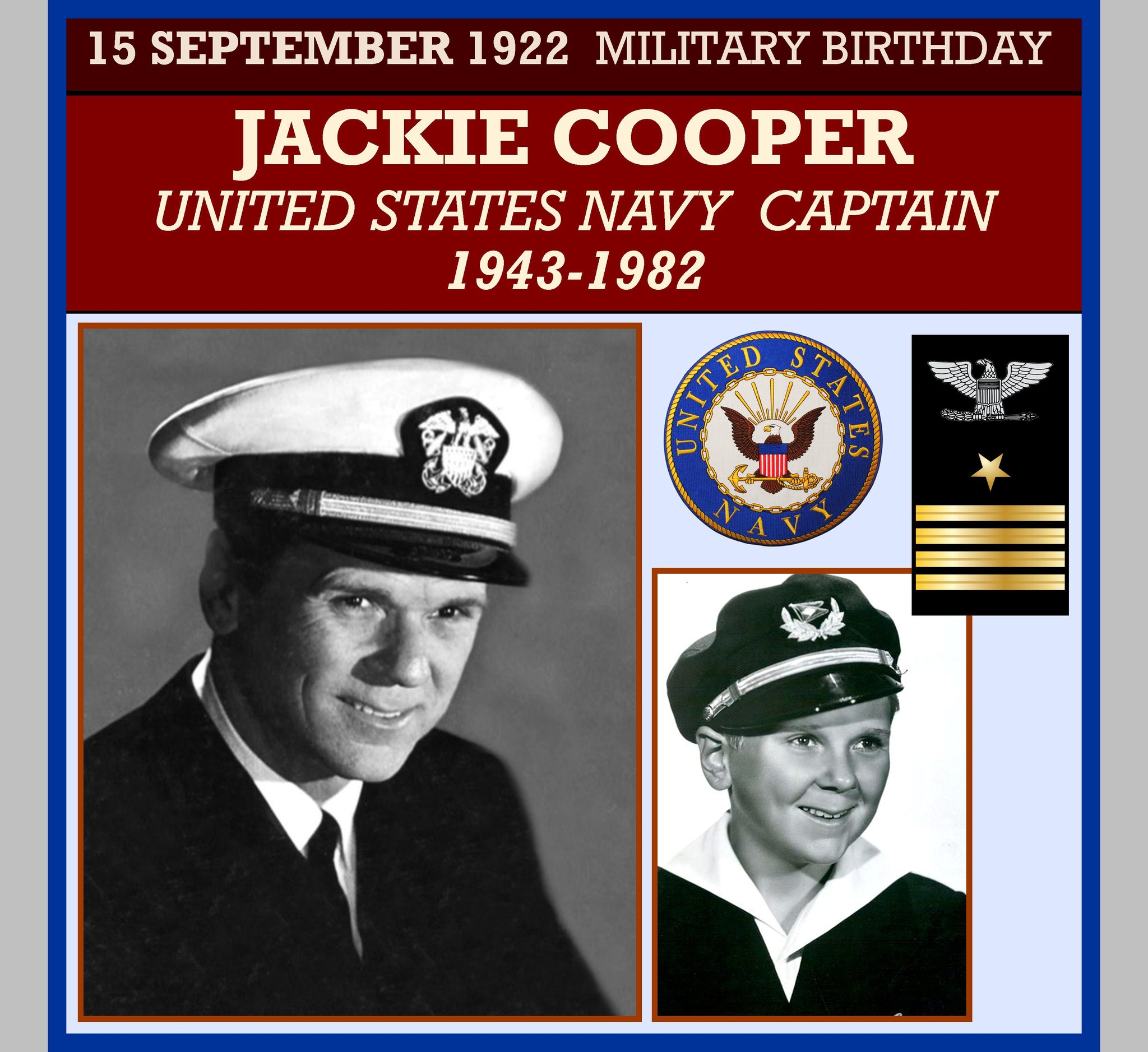 Jackie served with the Navy in the South Pacific toward the end of World War II. Then, quietly and without publicity or fanfare, compiled one of the most distinguished peacetime military careers of anyone in his profession. In 1961, as his weekly TV series “Hennesey” was enhancing naval recruiting efforts, accepted a commission as a line officer in the Naval Reserve with duties in recruitment, training films and public relations. Holder of a multi-engine pilot license, he later co-piloted jet planes for the Navy, which made him an Honorary Aviator authorized to wear wings of gold–at the time only the third so honored in naval aviation history. By 1976 had attained the rank of Captain, and was in uniform aboard the carrier USS Constellation for the Bicentennial celebration on July 4. In 1980 the Navy proposed a period of active duty at the Pentagon which would have resulted in a promotion to Rear Admiral, bringing him even with Air Force Reserve Brigadier General James Stewart. Fresh on the heels of a second directing Emmy, he felt his absence would impact achieving a long-held goal of directing motion pictures, and reluctantly declined. (The opportunity in films never materialized.) Holds Letters of Commendation from six Secretaries of the Navy. Was honorary chairman of the US Navy Memorial Foundation and a charter member of VIVA, the effort to return POW-MIAs from Vietnam. Upon retirement in 1982 was decorated with the Legion of Merit by Navy Secretary John Lehman. Other than Stewart, no performer in his industry has achieved a higher uniformed rank in the US military. (Glenn Ford was also a Naval Reserve Captain, and director and Captain John Ford was awarded honorary flag rank upon his 1951 retirement from the Naval Reserve.)