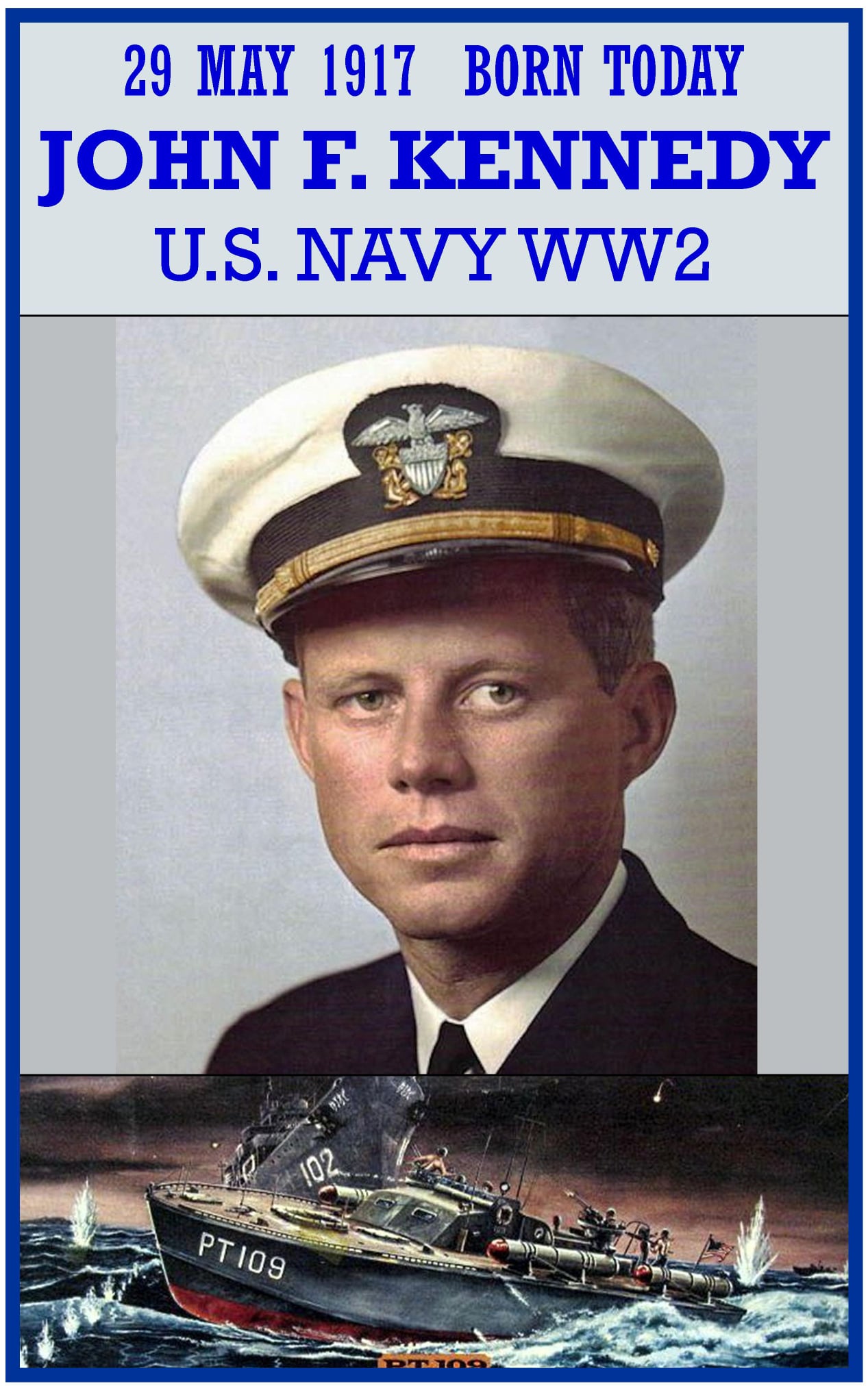John F. Kennedy (May 29, 1917 â November 22, 1963) Despite having a bad back, Kennedy was able to join the U.S. Navy. 1943 given command of PT-109. On 30 May, several PT boats, including PT 109 were ordered to the Russell Islands in preparation for the invasion of New Georgia. After the invasion of Rendova, PT 109 moved to Lumbari. fifteen boats sent out on patrol on the night of 1-2 August 1943 to intercept Japanese warships in the straits. Ensign George H. R. Ross, whose ship was damaged, joined Kennedy’s crew that night. The PT boat was creeping along to keep the wake and noise to a minimum in order to avoid detection. Around 0200 with Kennedy at the helm, the Japanese destroyer Amagiri traveling at 40 knots came out of the darkness and cut PT 109 in two in ten seconds. Because the remnant was listing badly and starting to swamp, Kennedy decided to swim for a small island barely visible (actually three miles) to the southeast. Five hours later, all eleven survivors had made it to the island after having spent a total of fifteen hours in the water. Native coast watchers Biuku Gasa and Eroni Kumana first discovered the 109 crew on Olasana Island and paddled their messages to Ben Kevu, a Senior Scout who sent them on to coast watcher Lieutenant Reginald Evans. On the morning of August 7, Evans radioed the PT base on Rendova. Lieutenant “Bud” Liebenow, a friend and former tentmate of Kennedy’s, rescued Kennedy and his crew on Olasana Island on August 8, 1943 aboard his boat, PT-157.