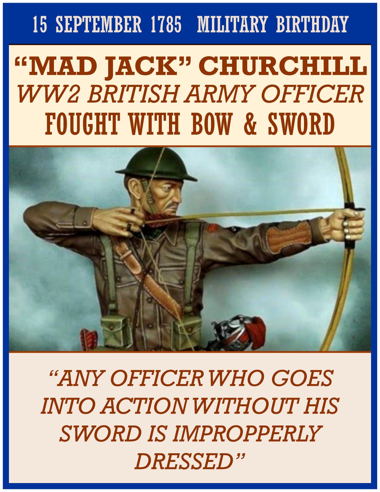 John Malcolm Thorpe Fleming Churchill, DSO & Bar, MC & Bar (16 September 1906 – 8 March 1996) was a British Army officer who fought in the Second World War with a longbow, bagpipes, and a Scottish broadsword. Nicknamed “Fighting Jack Churchill” and “Mad Jack”, he was known for the motto: “Any officer who goes into action without his sword is improperly dressed.”