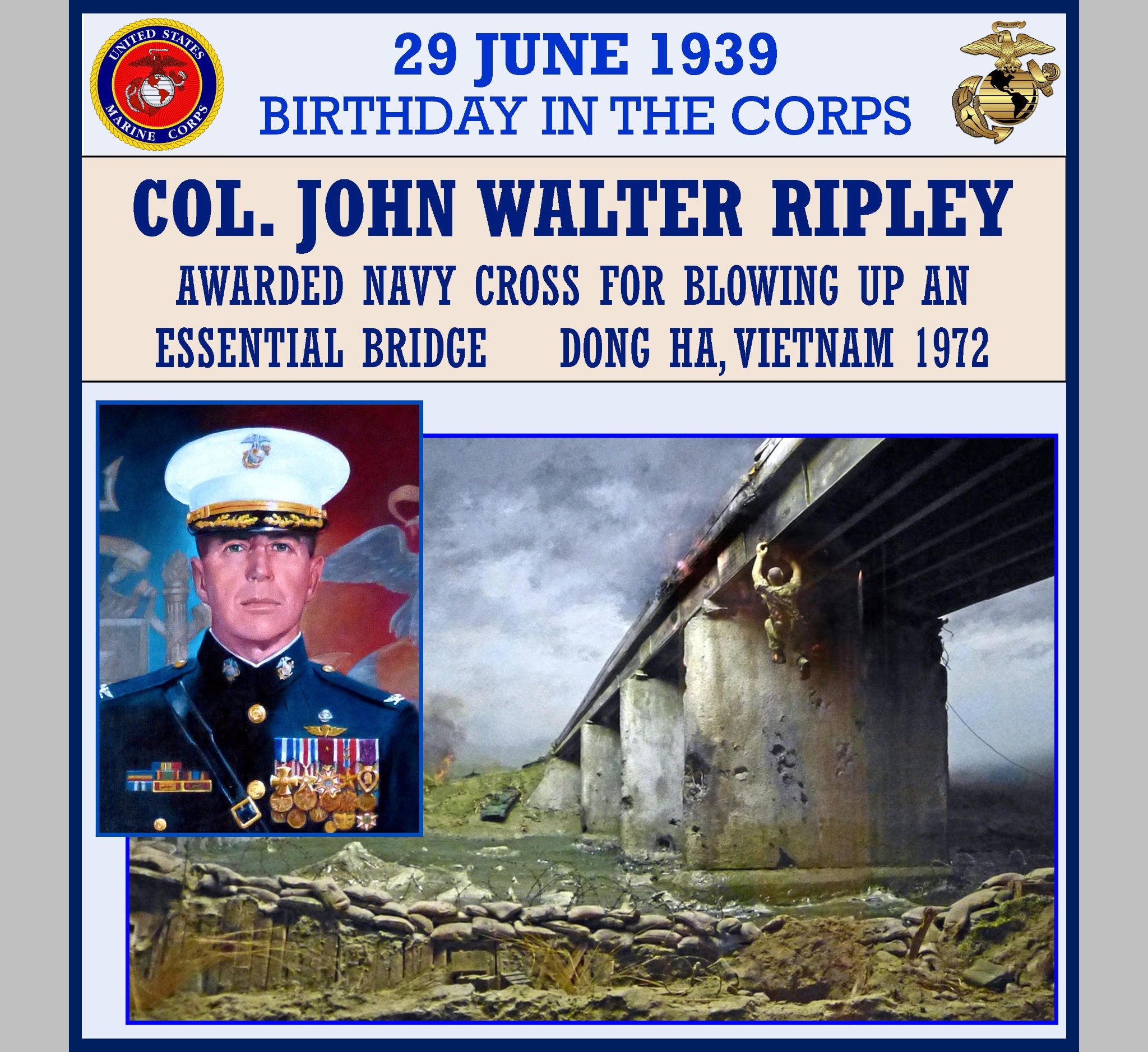 John Walter Ripley (June 29, 1939 – October 28, 2008) was a decorated United States Marine Corps Colonel who received the Navy Cross for his actions in combat during the Vietnam War. On Easter morning 1972, Captain Ripley repeatedly exposed himself to intense enemy fire over a three-hour period as he prepared to blow up an essential bridge in Dong Ha. His actions significantly hampered the North Vietnamese Army’s advance into South Vietnam. The story of “Ripley at the Bridge” is legendary in the Marine Corps and is captured in a gripping diorama at the United States Naval Academy.