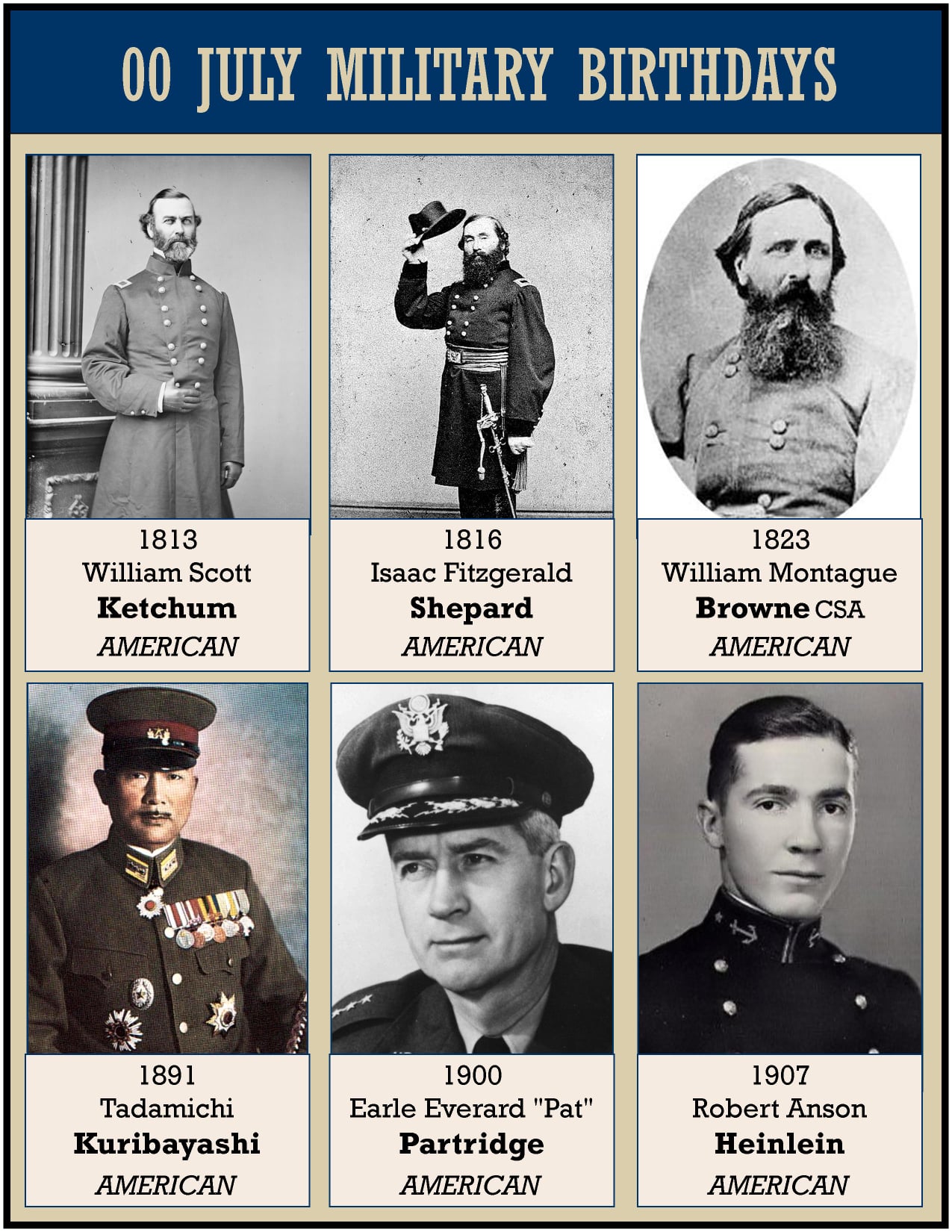 1813 William Scott Ketchum (July 7, 1813-1871) Born in Norwalk, Connecticut. U. S. Army officer before and during the American Civil War. Graduated from the United States Military Academy, at West Point, New York in 1834. He served in the Seminole Wars and on the Western frontier. At the start of the Civil War, Major Ketchum now with US Fourth Infantry Regiment commanded Fort Dalles in Oregon, protecting settlers from Indian raids. He was ordered to San Francisco and then sent to take command of the federal troops in Southern California to protect it from secessionist rising and Confederate invasion from Arizona or Texas. Headquartered in San Bernardino, California his troops kept an eye on the secessionists of the region and reinforced Fort Yuma. Relieved by California Volunteer troops, Ketchum and his regiment assembled in San Pedro for the voyage to eastern United States in the late fall of 1861. Ketchum was promoted to lieutenant colonel in late 1861. He was made a brigadier general of Volunteers in February 1862. For the rest of the war he had staff duties in Washington D.C. and was concerned with inspection, recruiting, and auditing.